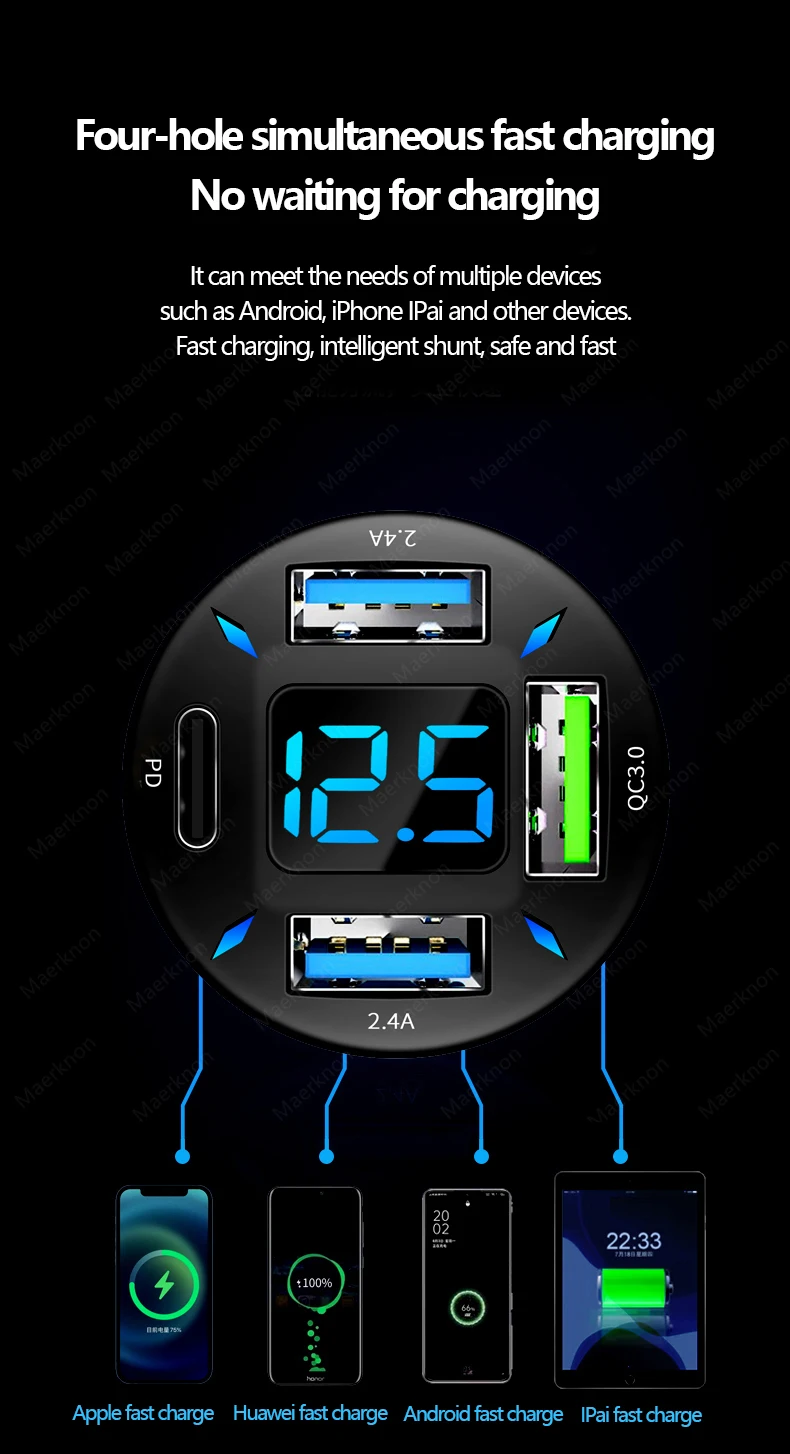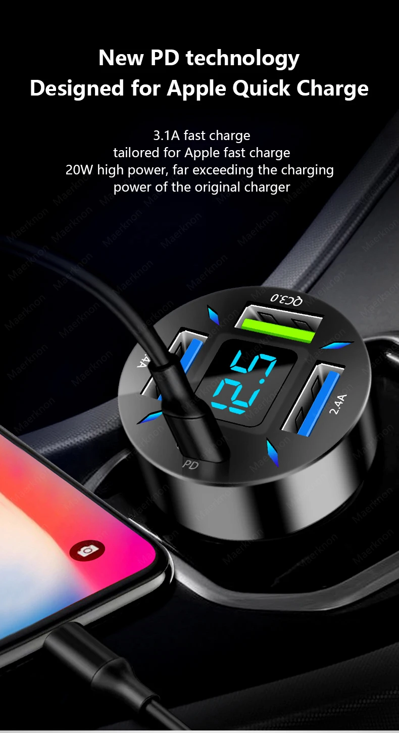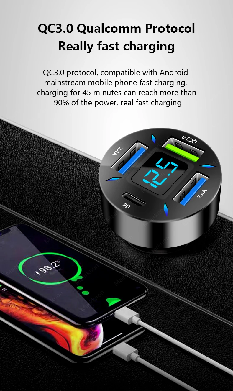 Cargador de coche USB de 4 puertos 66W PD tipo C adaptador de cargador de teléfonos de carga rápida para iPhone Xiaomi Huawei Samsung cargador rápido en coche