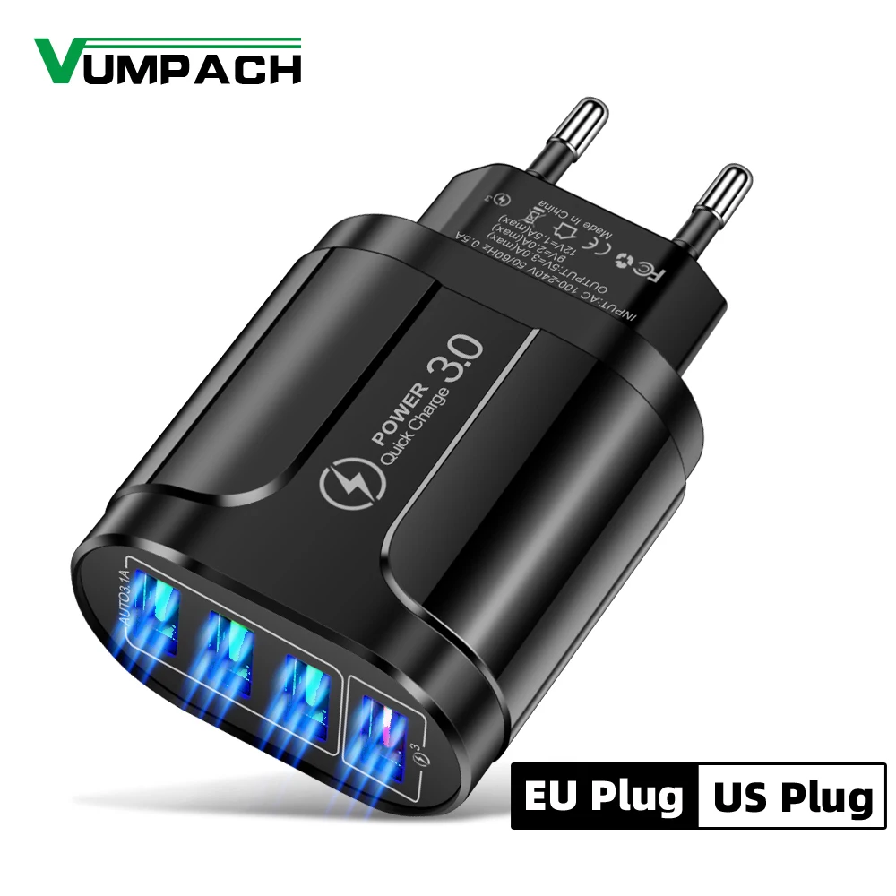 Comprar Cargador USB 4 USB de 45W, carga rápida QC 3,0, carga de pared para iPhone 15, 14, Samsung, Xiaomi, móvil, 4 puertos, adaptador de enchufe UE y EE. UU., viaje