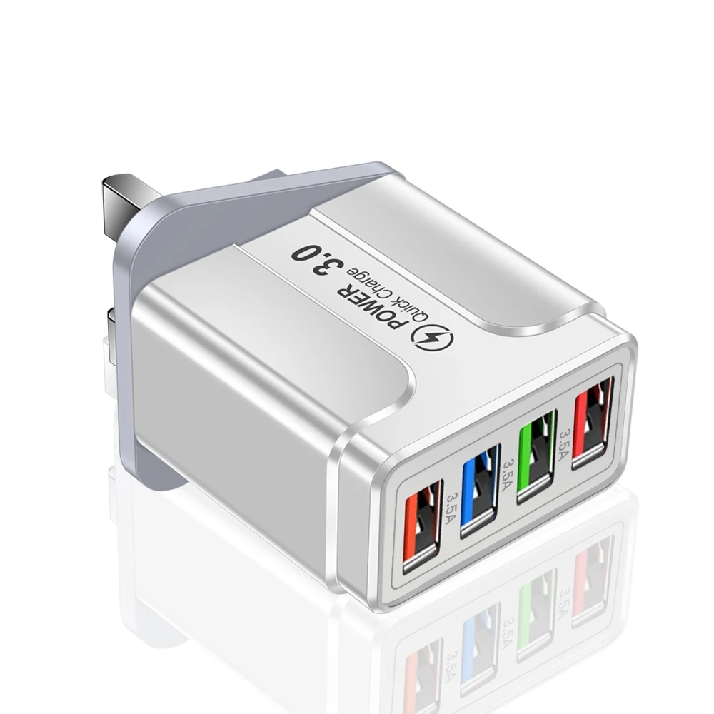 Cargador USB de 48W 4, carga rápida QC3.0, cargador de teléfono móvil para iPhone 14, 13 Pro, Xiaomi, Samsung, cargador de carga rápida, adaptador de paredLa siguiente es una descripción detallada del cargador del teléfono móvil:1.Velocidad de carga rápida: este cargador de teléfono móvil puede proporcionar la mejor velocidad de carga para cuatro dispositivos al mismo tiempo y puede satisfacer las necesidades de carga de múltiples dispositivos al mismo tiempo.2.Protección multifuncional: múltiples funciones de protección integradas, como sobrecorriente, sobrecalentamiento y cortocircuito, lo que garantiza la estabilidad y seguridad de la salida de corriente.Puede identificar automáticamente los requisitos del dispositivo y generar corriente adecuada para proteger su dispositivo contra daños.3.Amplia compatibilidad: este cargador es compatible con varias marcas de teléfonos, tabletas y otros productos digitales y tiene una amplia gama de aplicaciones.Ya sea Apple, Android u otras marcas de dispositivos, se puede utilizar para cargar.4.Materiales de PC ignífugos, anticaídas y resistentes al fuego: fabricados con materiales de PC ignífugos, anticaídas y resistentes al fuego, lo que proporciona mayor seguridad y durabilidad, previene eficazmente incendios y tiene una vida útil más larga.5.Cargador USB universal: este cargador admite una entrada de voltaje de banda ancha de 100-240 V y es adecuado para los estándares de red eléctrica de varios países y regiones, lo que lo hace conveniente para su uso en múltiples lugares tanto a nivel nacional como internacional sin preocuparse por problemas con el adaptador de corriente.En resumen, este cargador de teléfono móvil tiene una velocidad de carga rápida, protección multifuncional, amplia compatibilidad, diseño retardante de llama y resistente a caídas y función de carga USB universal. Es un cargador de teléfono móvil cómodo y seguro adecuado para diversas ocasiones y dispositivos. Si tiene alguna otra pregunta, ¡no dude en preguntar!