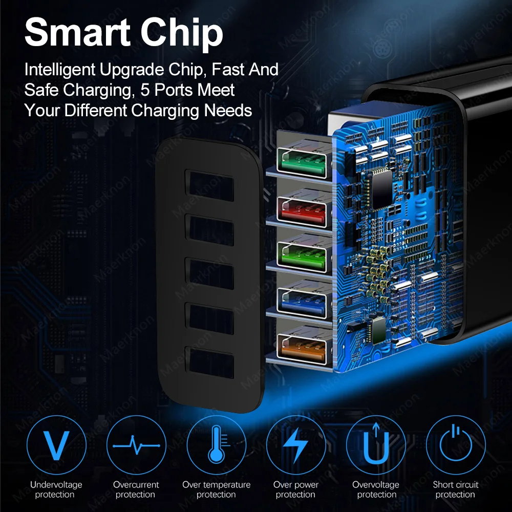Comprar Cargador USB de 5 puertos, adaptador de carga rápida 3,0, 48W, enchufe de pared para iphone, Samsung, Xiaomi, UE/EE. UU./Reino Unido