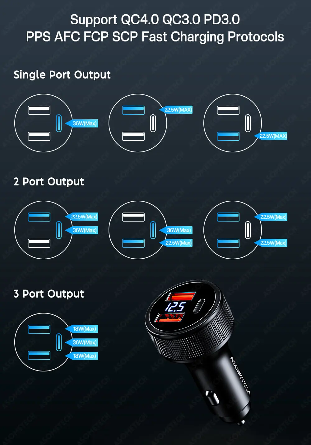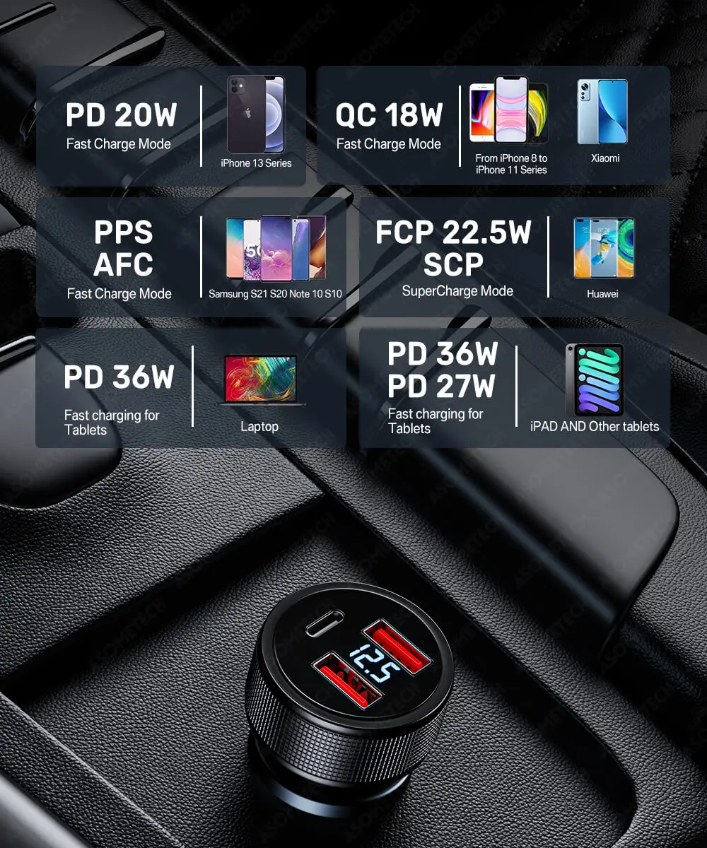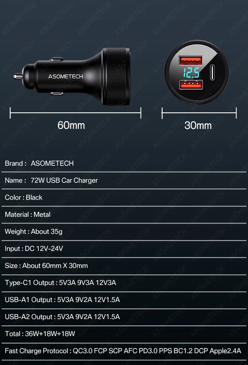 Comprar Cargador USB de 72W para coche, dispositivo de carga rápida QC 3,0, PD 3,0, SCP, pantalla LED, para IPhone 13, 14 Pro Max, Samsung, Xiaomi, Huawei, IPad