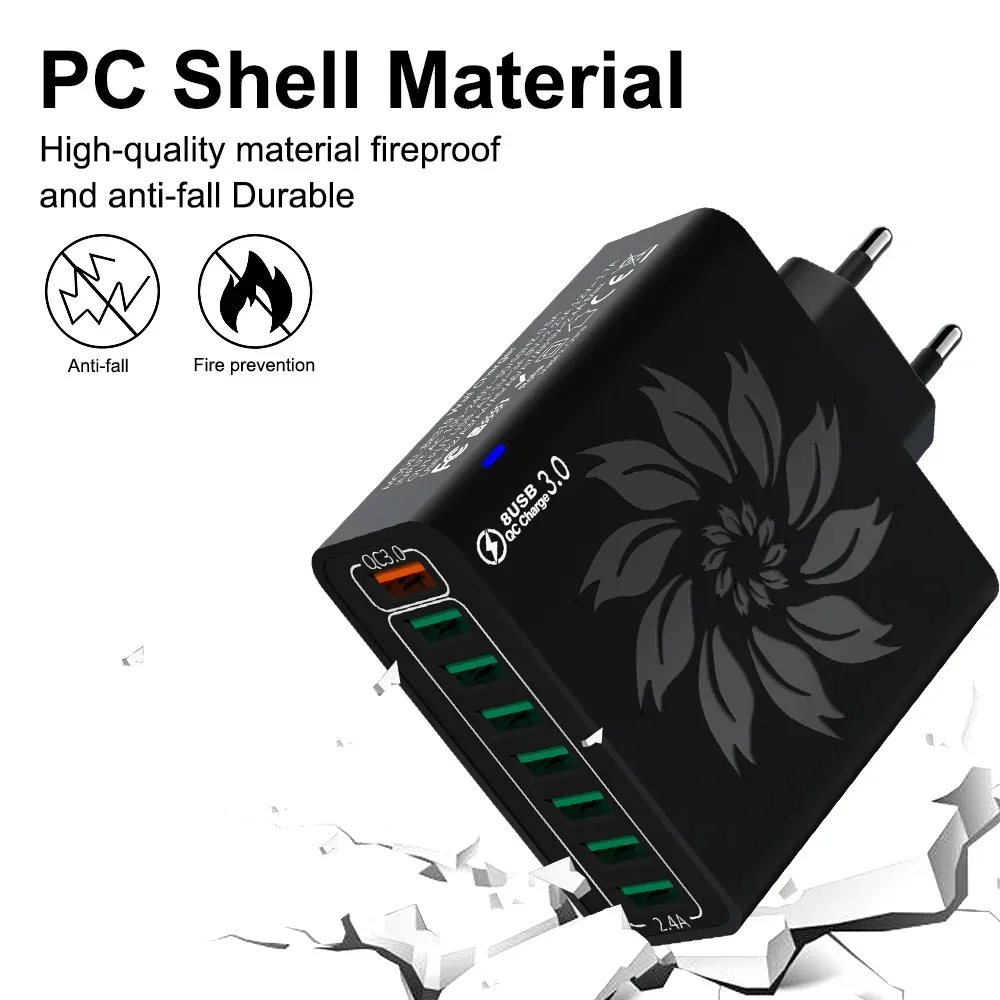 Modelo: BK319Entrada: AC100-240V~50/60Hz 0,5A máx.;Puertos: 8 puertos USB-A;⚡ Salida USB-A1 naranja: 5V/3A 9V/2.22A 12V/1.7A⚡Salida USB-A2/A3/A4/A5/A6/A7/A8: 5V/2,4A máx.Especificación: enchufe UE/EE. UU./KR*La tecnología inteligente del cargador reconoce cualquier dispositivo conectado y proporciona la corriente de carga más adecuada para garantizar una carga más rápida y eficiente.*Compatible con voltaje de 100-240V, no se preocupe por los viajes transnacionales.*Múltiples protecciones como sobrecorriente, sobrecarga, sobretemperatura, sobretensión, protección contra cortocircuitos y anticombustión lo hacen más seguro de usar.Paquete incluido:1 cargador multipuerto.