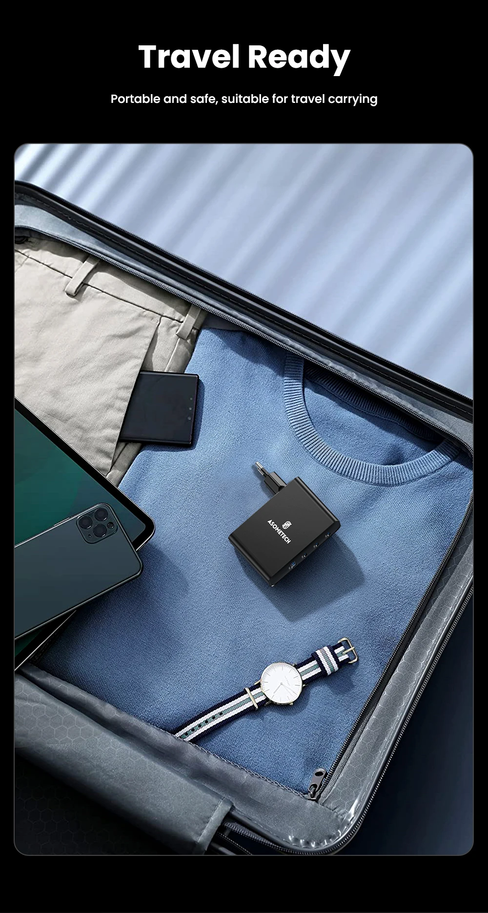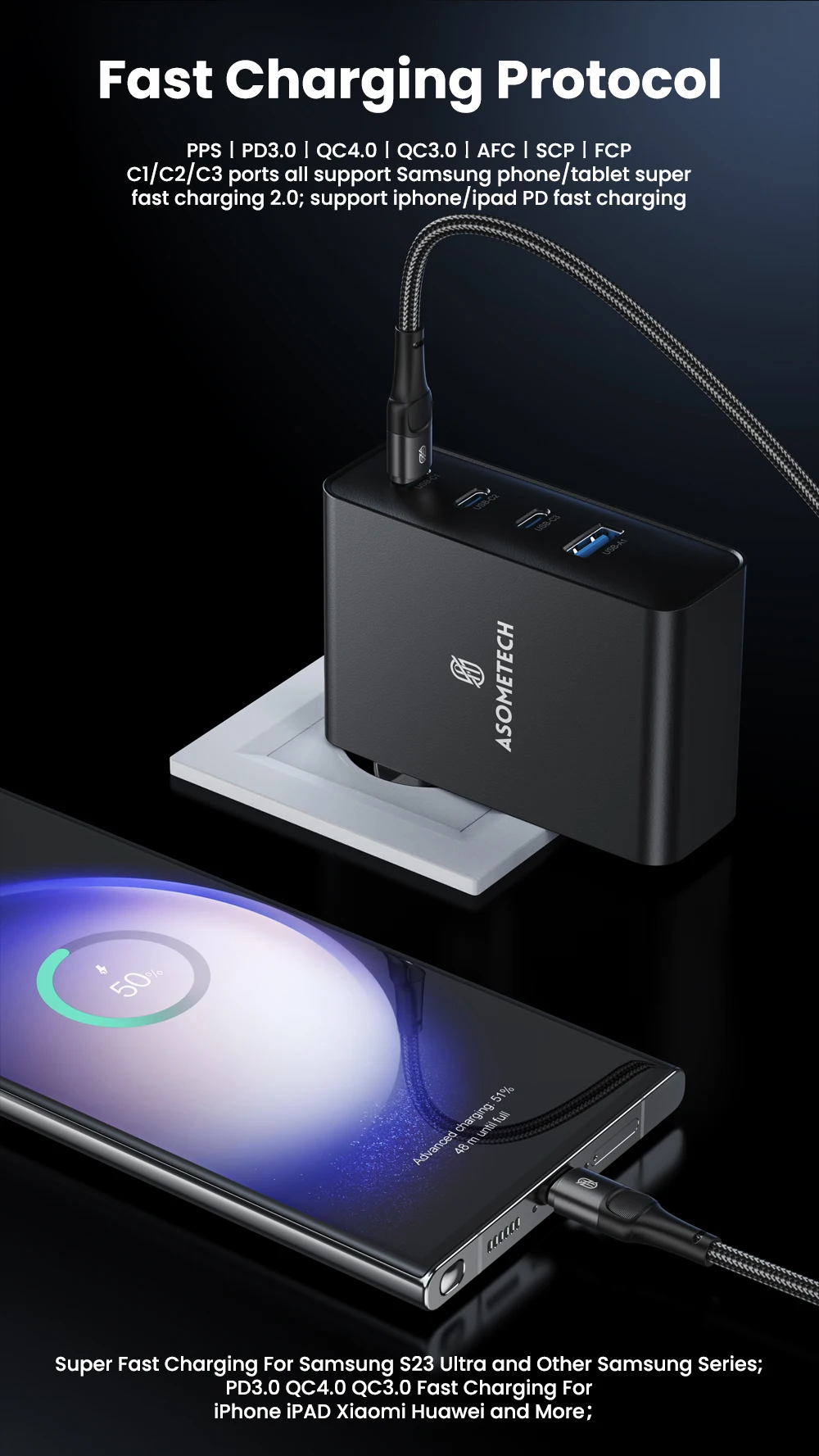 ASOMETECH Cargador GaN 100W PD QC 4.0 3,0 Cargador rápido USB Tipo C Carga rápida Cargador de teléfono USB C para iPhone 15 Pro Max Macbook