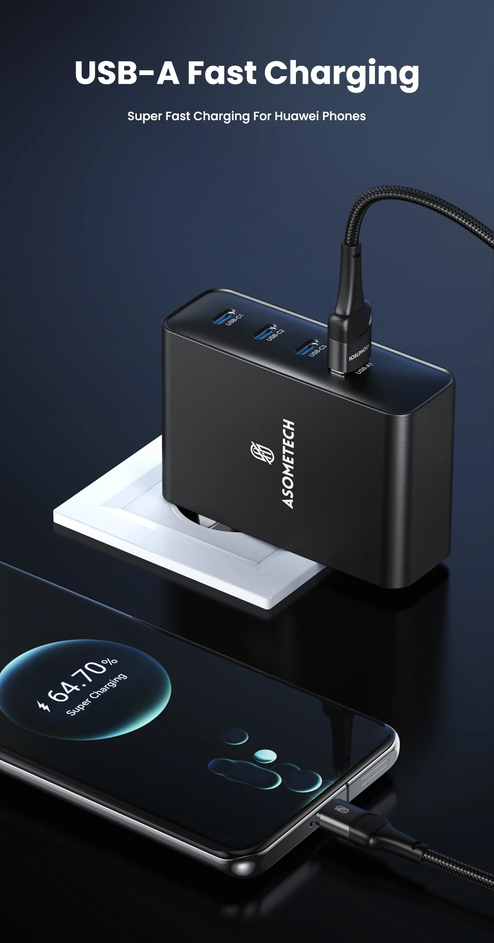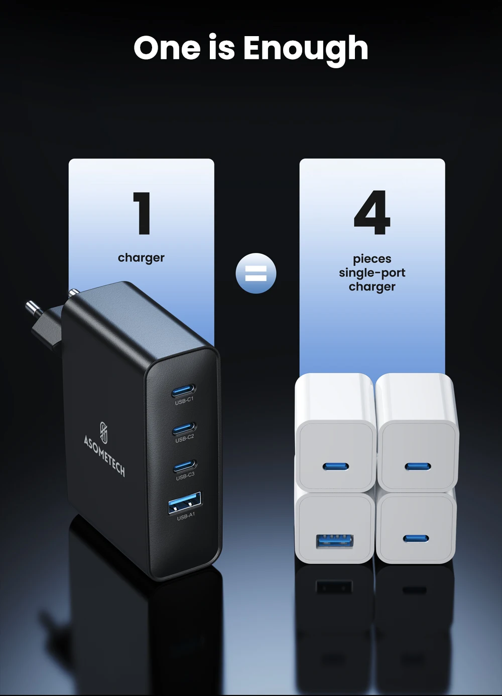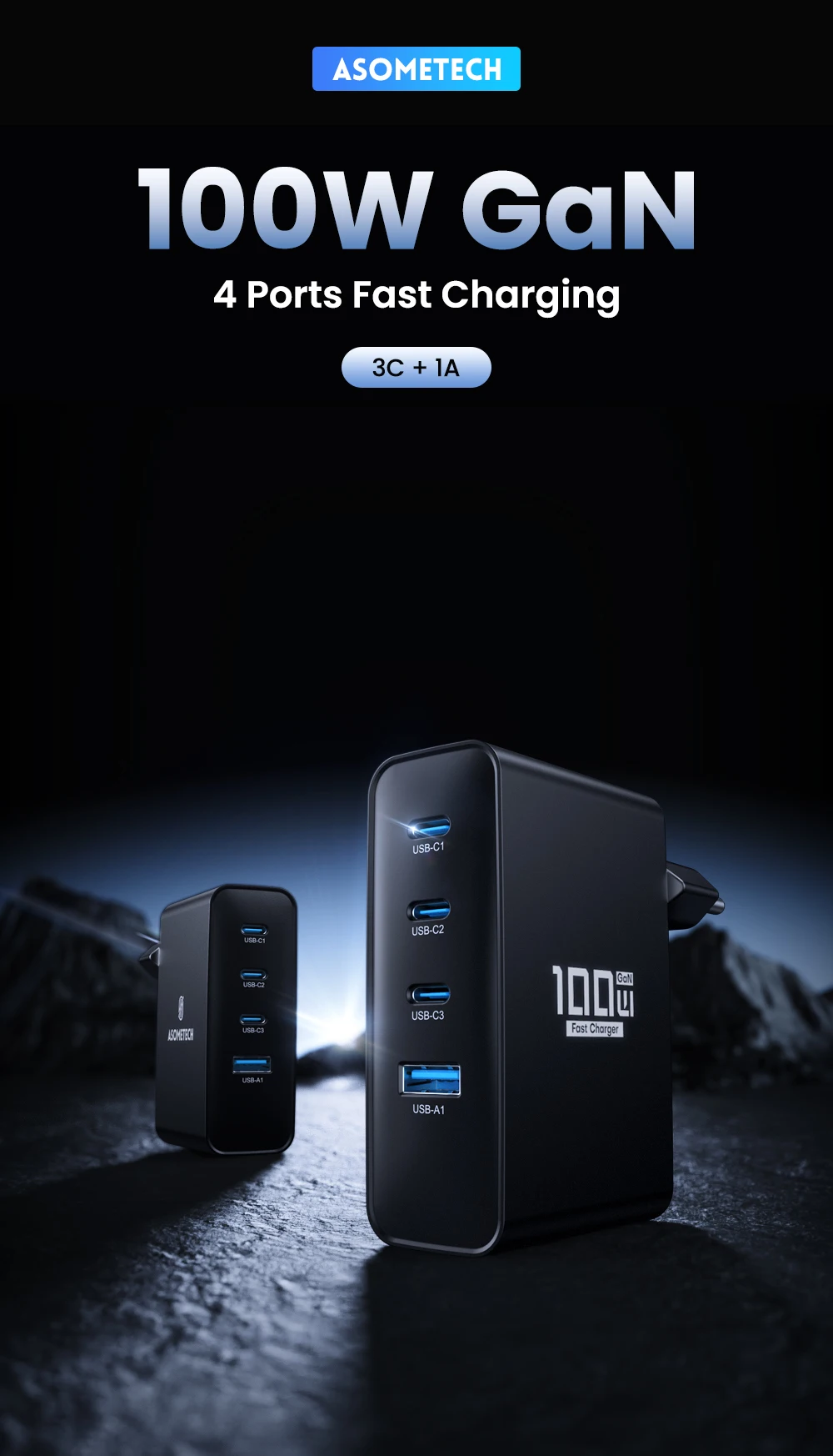 Cargador rápido ASOMETECH 100W-GaN - 4 puertos USB (3 USB C + 1 USB A)