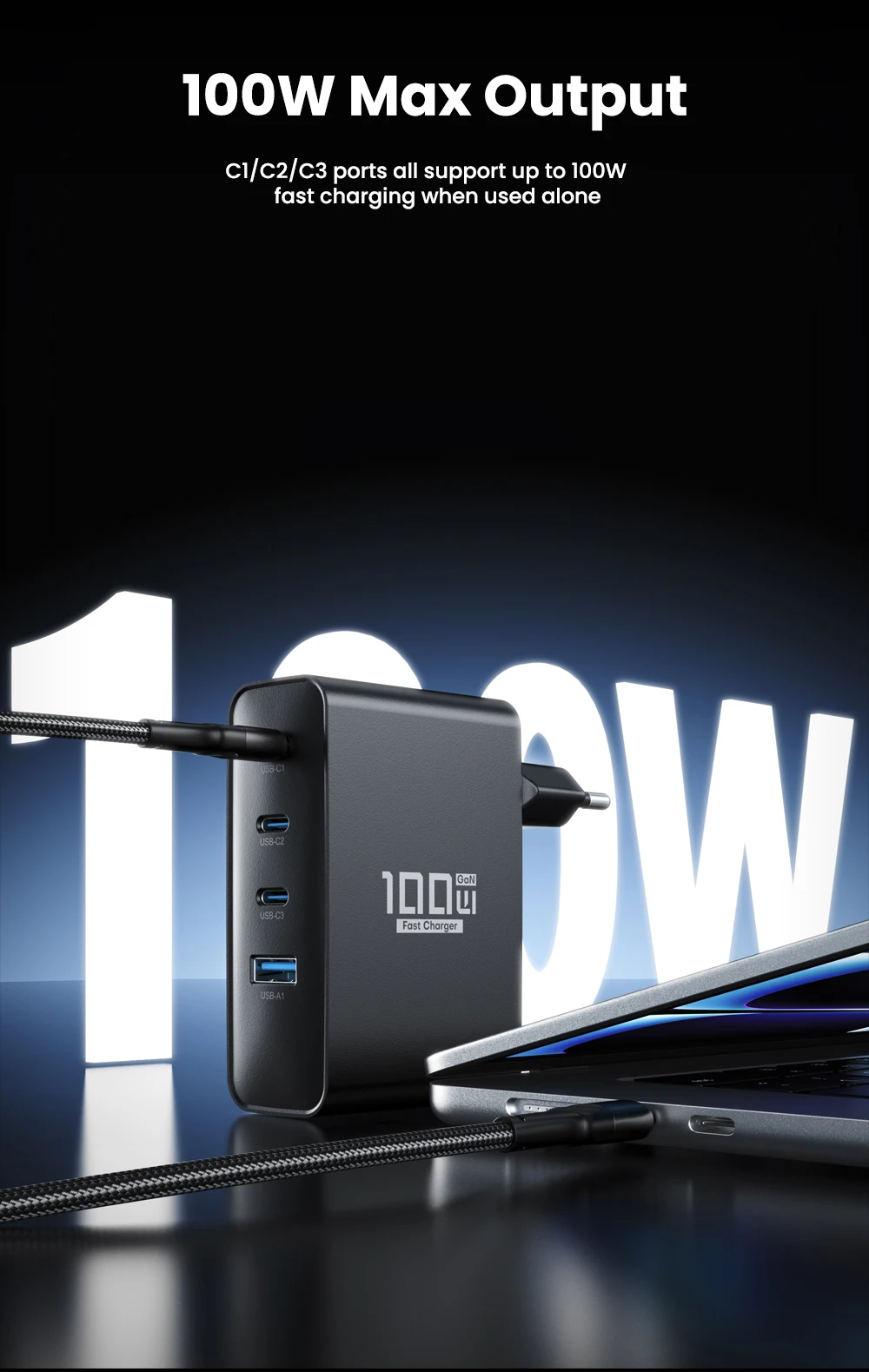 Los puertos C1/C2/C3 admiten una carga rápida de hasta 100 W cuando se usan solos