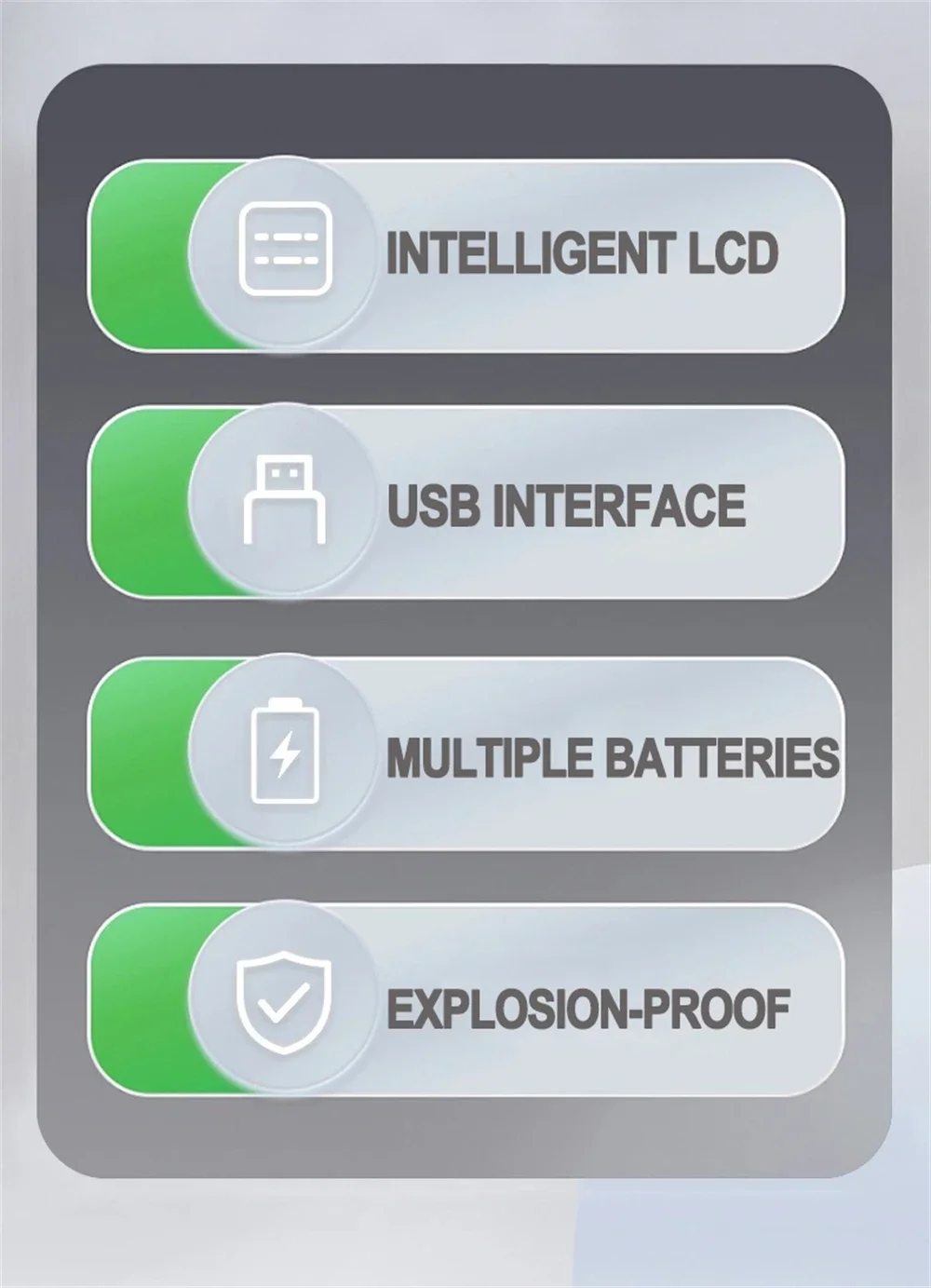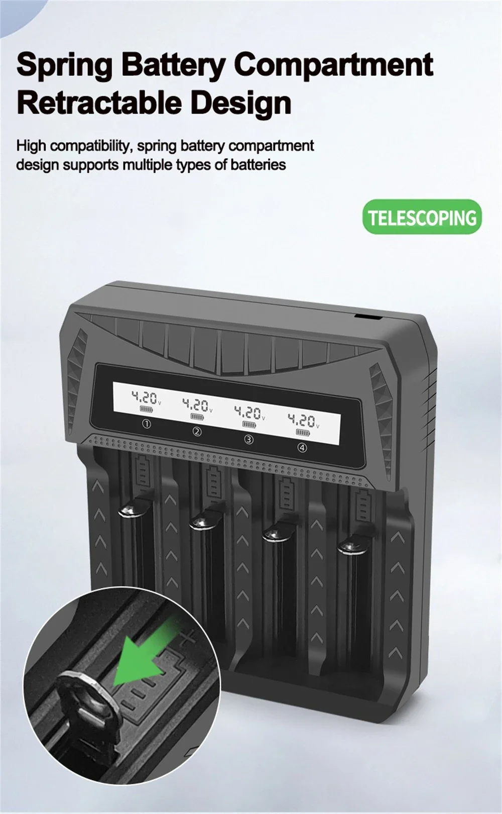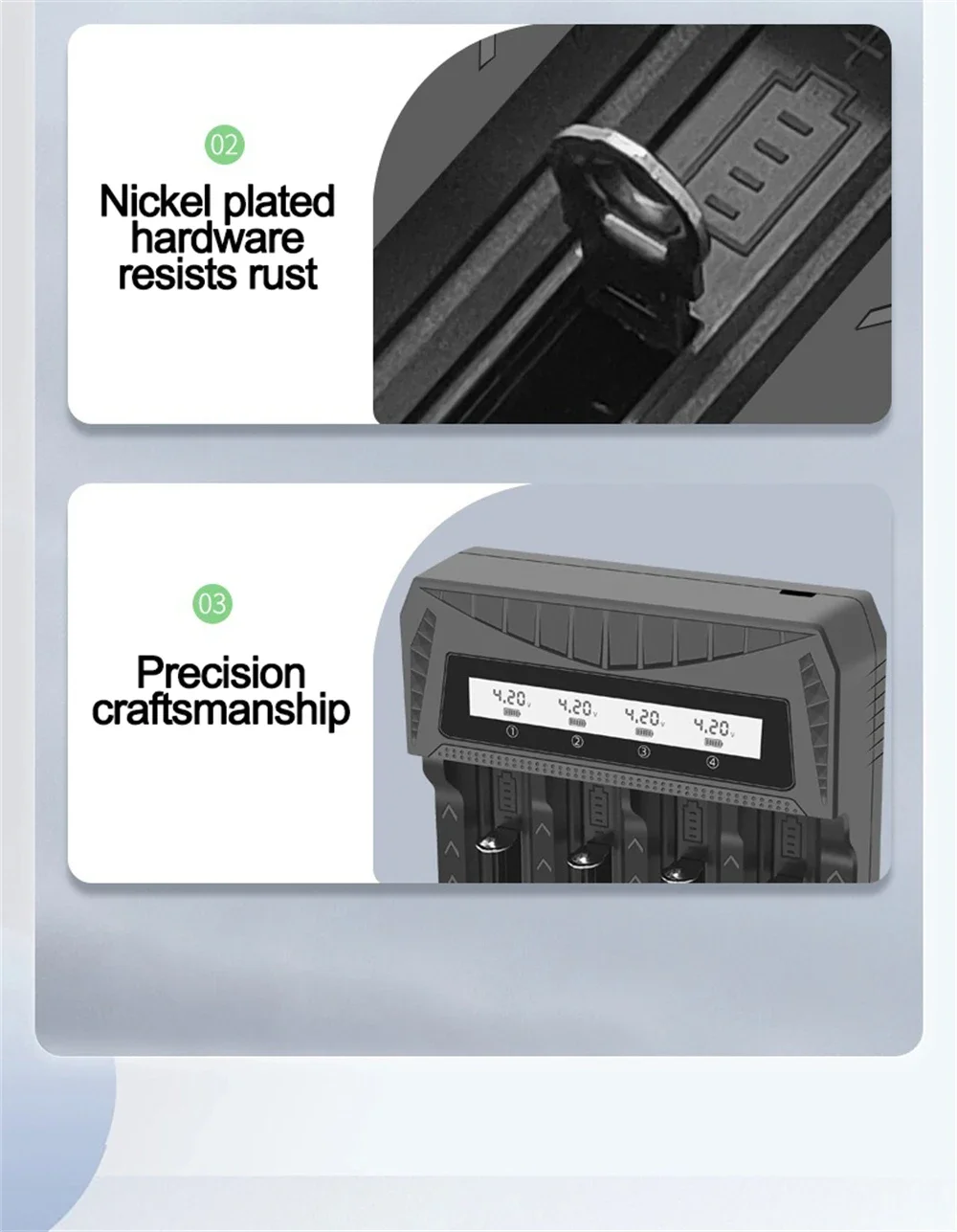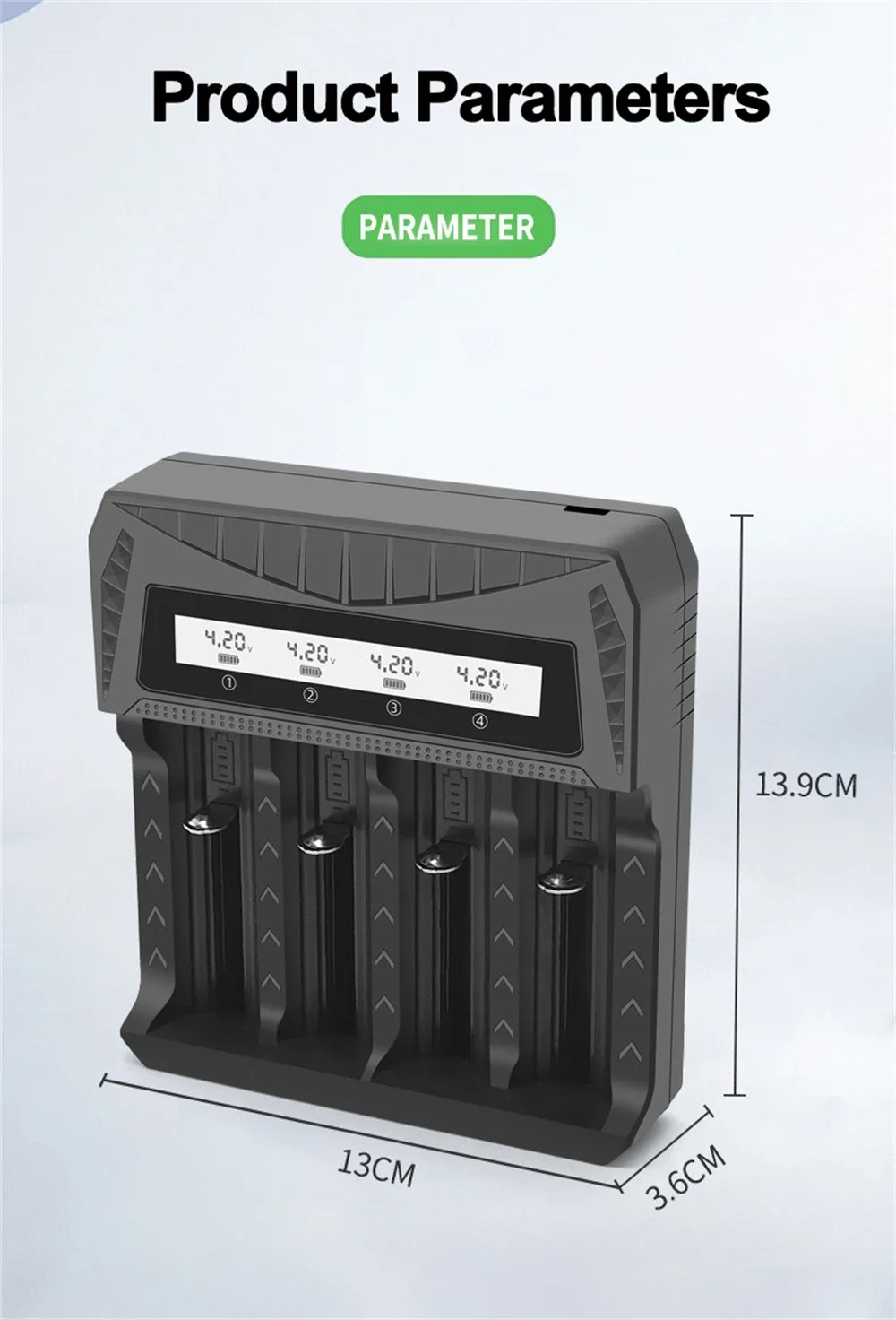 9.Introducción de la función: batería de litio multifuncional con pantalla LCD de cuatro cargas/detecta con precisión voltaje y corriente.Verifique el progreso de carga de la batería en cualquier momento y en cualquier lugar, conveniente y rápido/deténgase cuando esté lleno/protección contra sobrecorriente/protección de carga inversa de la batería/compatible con varias especificaciones de baterías de litio/viene con múltiples dispositivos de protección, protección contra sobrecarga para evitar la sobrecarga de la batería/se detiene automáticamente cuando está lleno, aplicable para 3.7-4.Batería de litio de 2V/1.2-1.Batería de níquel-hidruro metálico y níquel-cadmio de 5V.Paquete: