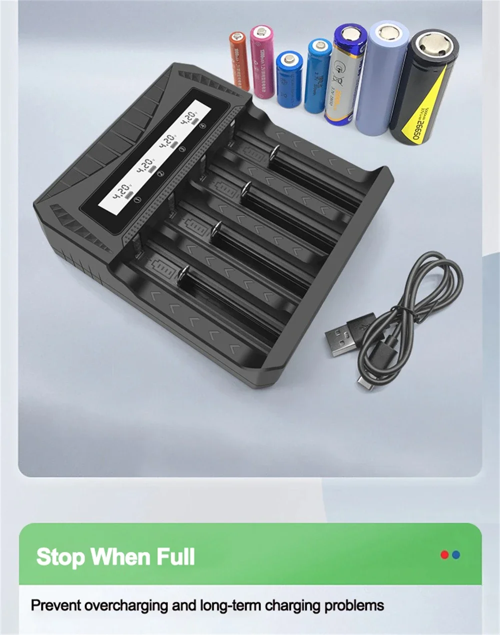 1.Pantalla LCD multifuncional de cuatro cargas con batería de litio/detecta con precisión voltaje y corriente