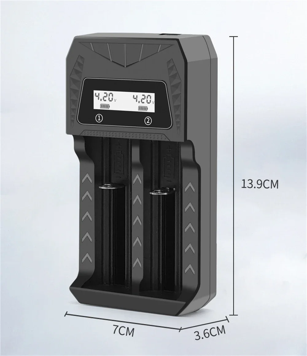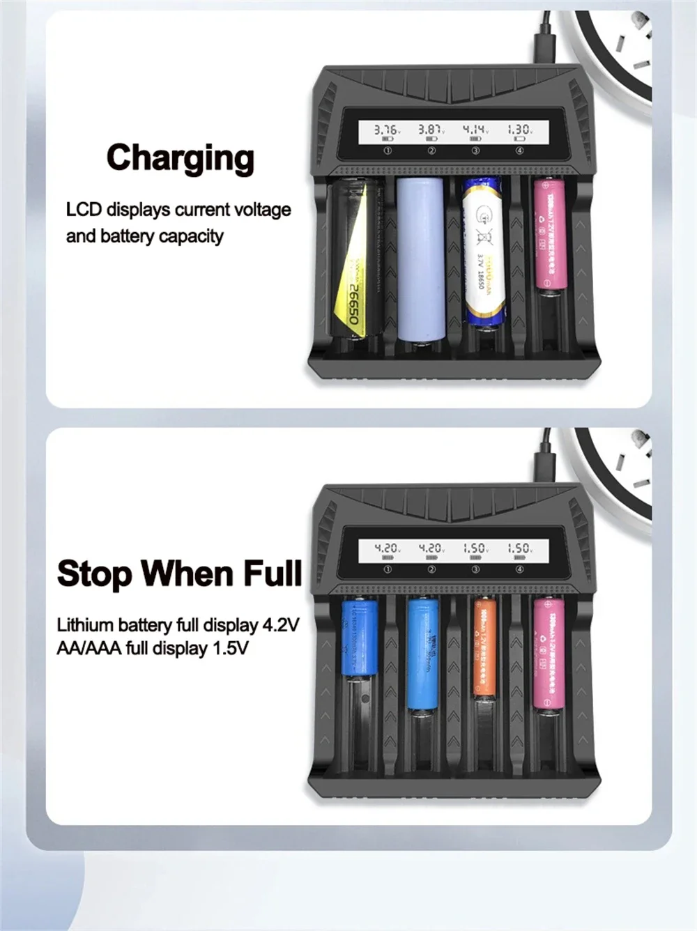 7.Indicación de carga: muestra el voltaje y la cantidad de carga.El voltaje completamente cargado de la batería de litio es de 4,2 V y el voltaje completamente cargado de la batería AA/AAA es de 1,5 V.La pantalla LCD muestra que la batería está completamente cargada.