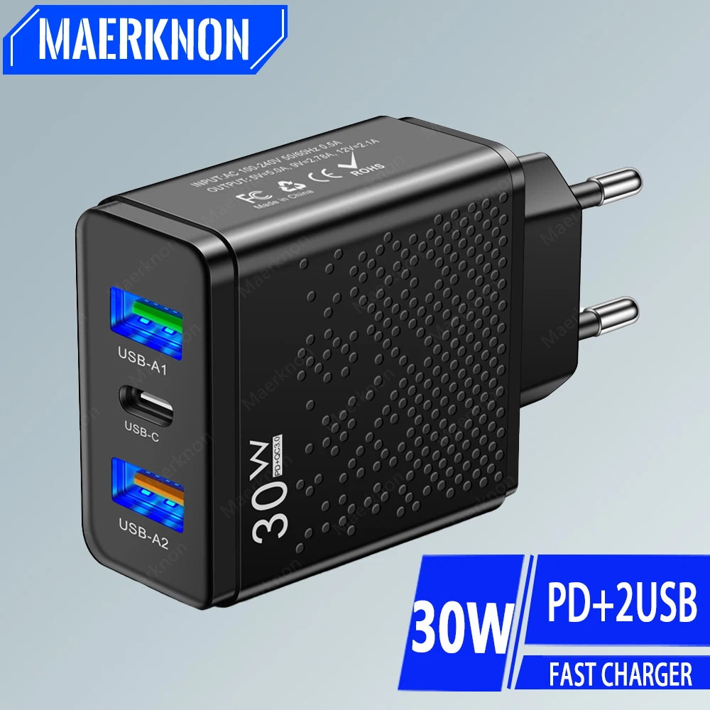 Comprar Cargador USB C de 30W, adaptador de cargador de teléfono tipo C PD de carga rápida para iPhone, Samsung, Huawei, Xiaomi QC3.0, cargador de pared USB de 3 puertos