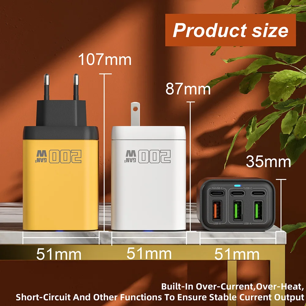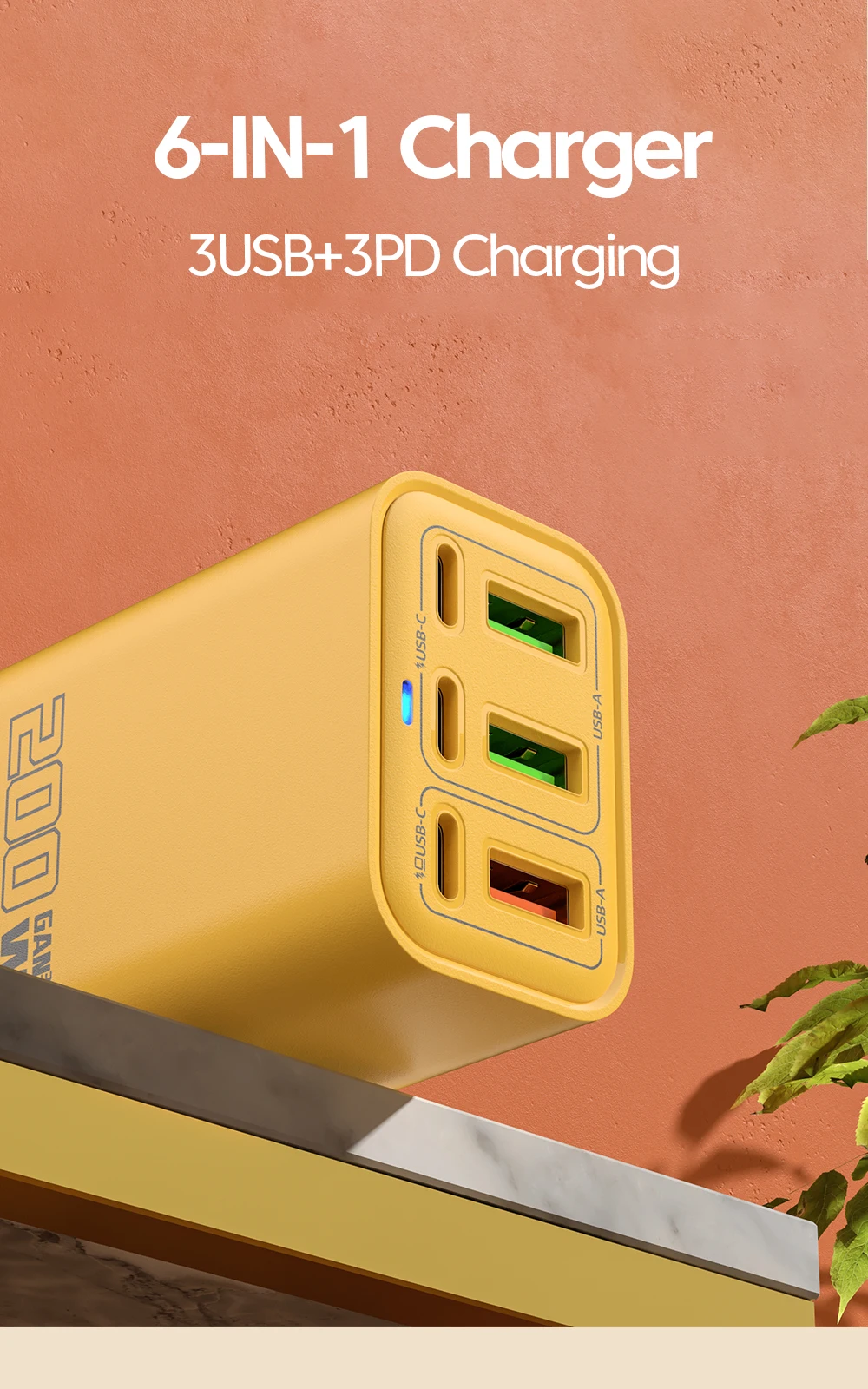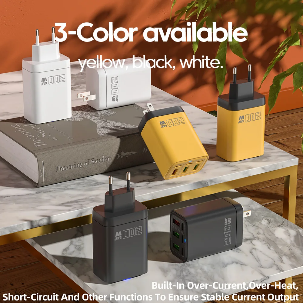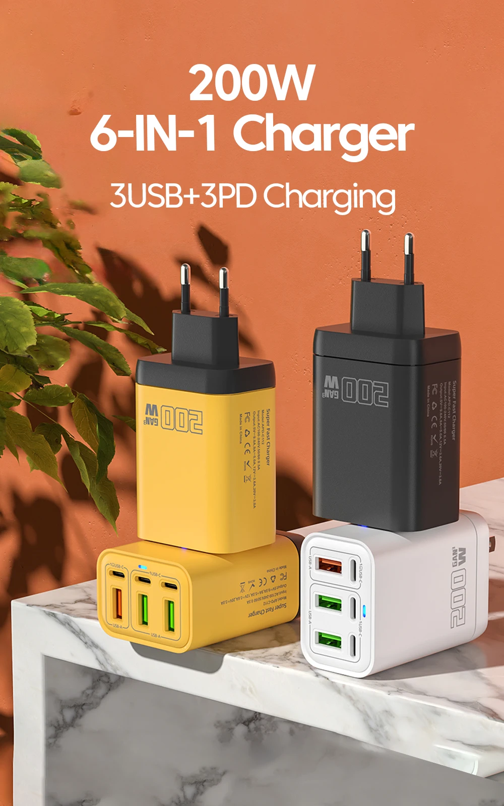 Comprar Cargador USB C de 6 puertos, adaptador de cargador PD de carga rápida 3,0 de 200W para iPhone, Xiaomi, Samsung, cargador de pared para teléfono móvil