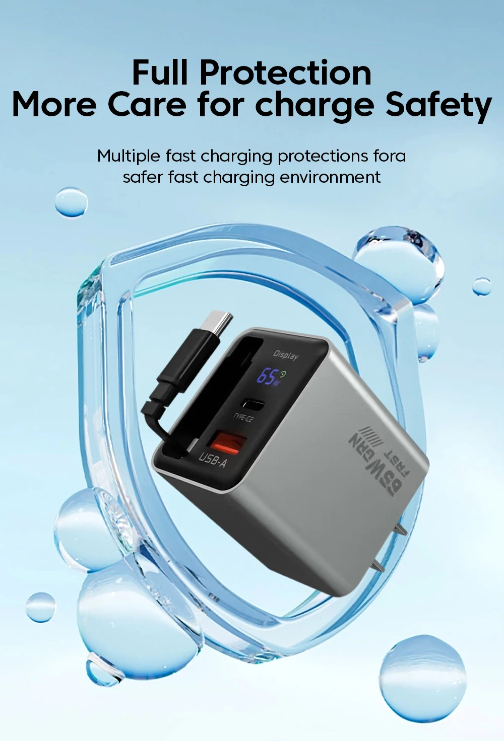 Cargador USB C de 65W con Cable retráctil, cargador de teléfono móvil con pantalla Digital, adaptador de carga rápida para iphone 15 16 17 Samsung