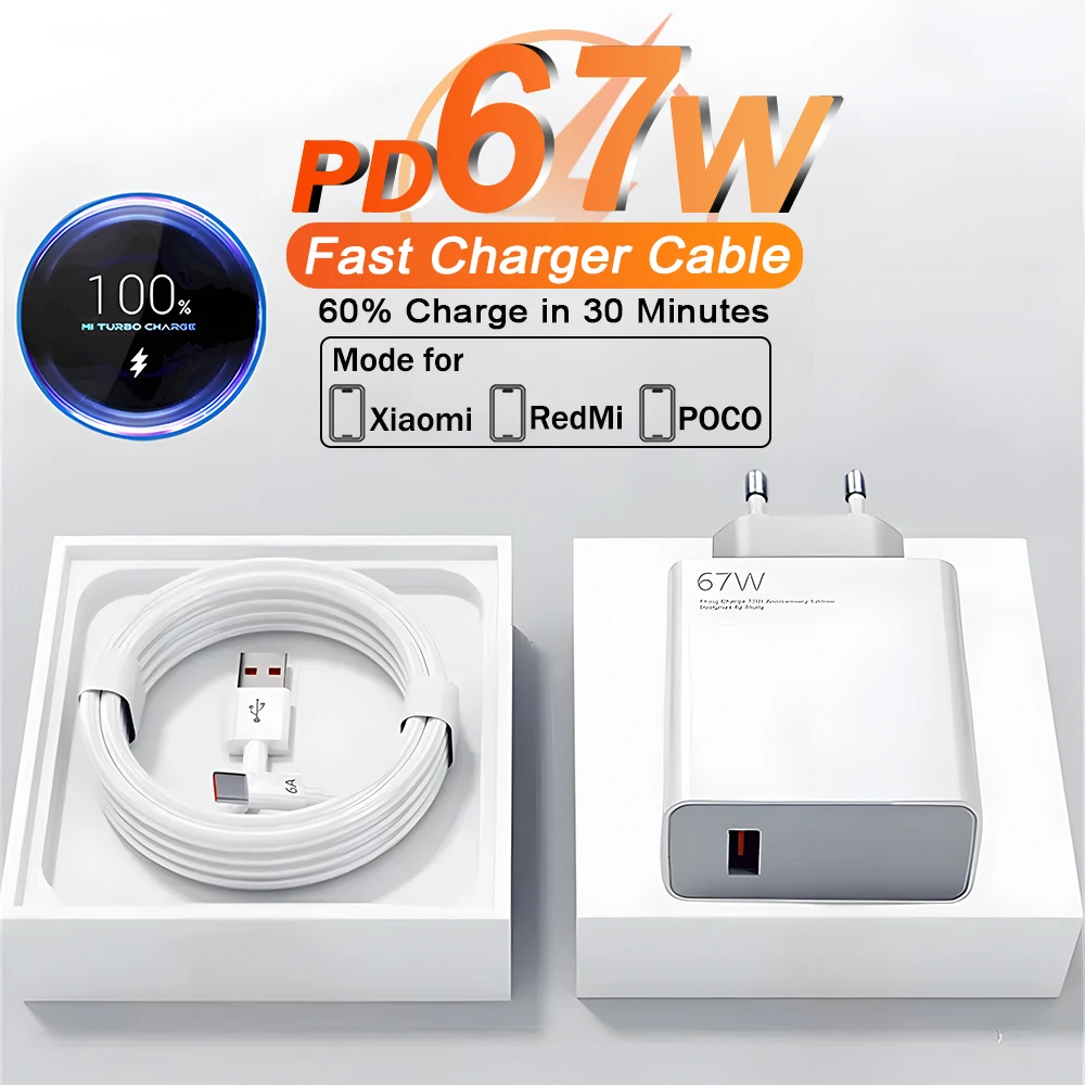 Cargador USB de carga rápida de 67W para Xiaomi 15 Ultra Redmi Note 14 13 12 Pro Poco tipo C Cable adaptador de enchufe UE EE. UU. Accesorios para teléfono
