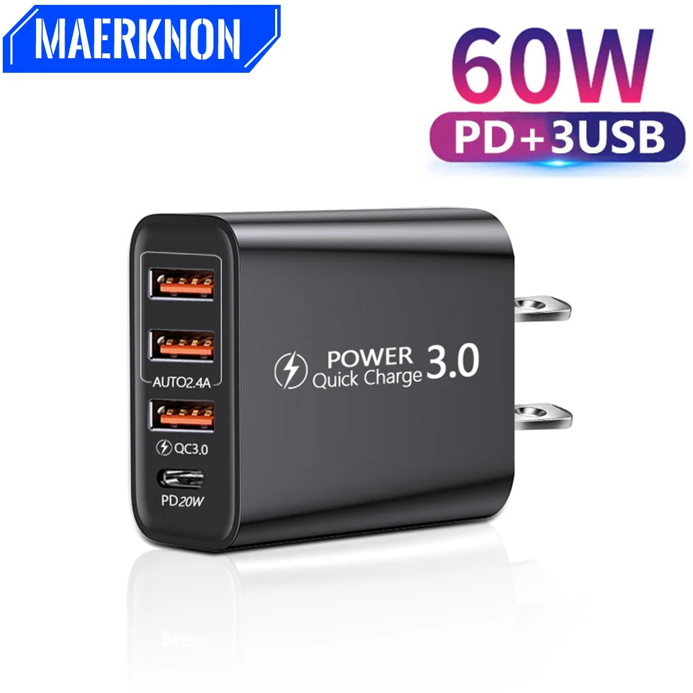Comprar Cargador USB de carga rápida para teléfono móvil, adaptador de pared de 60W, 4 puertos, PD, USB C, para iPhone, Samsung, Xiaomi, Redmi, 3,0