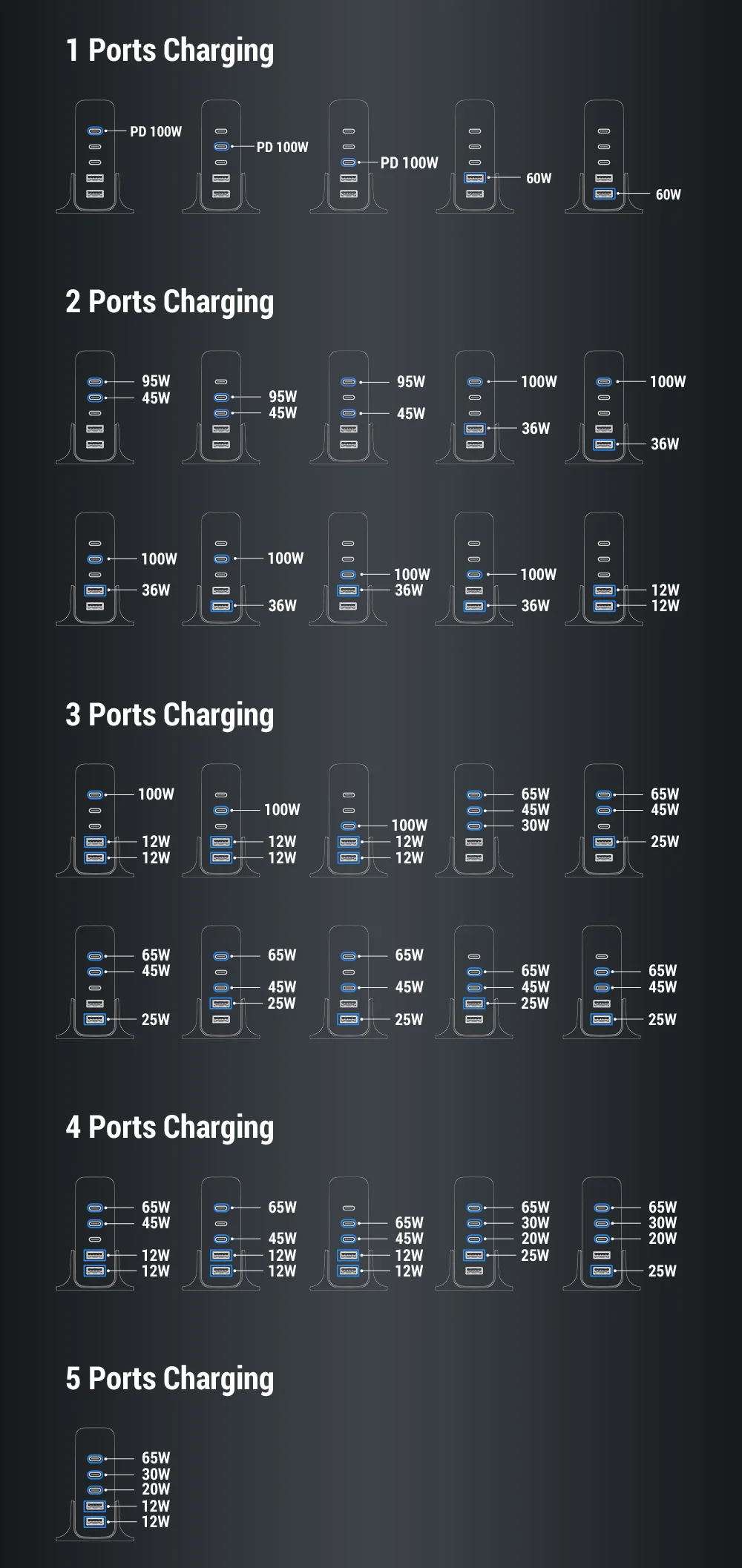 100W : 5V3A 9V3A 12V3A 15V3A 20V5A. PPS 3,3 V-21V=5A, 3,3 V-11V=5A