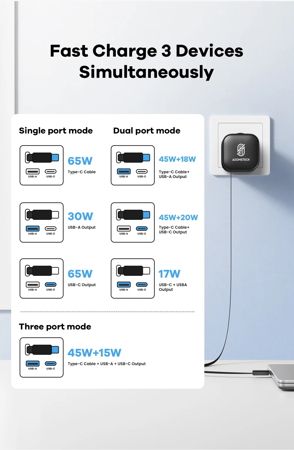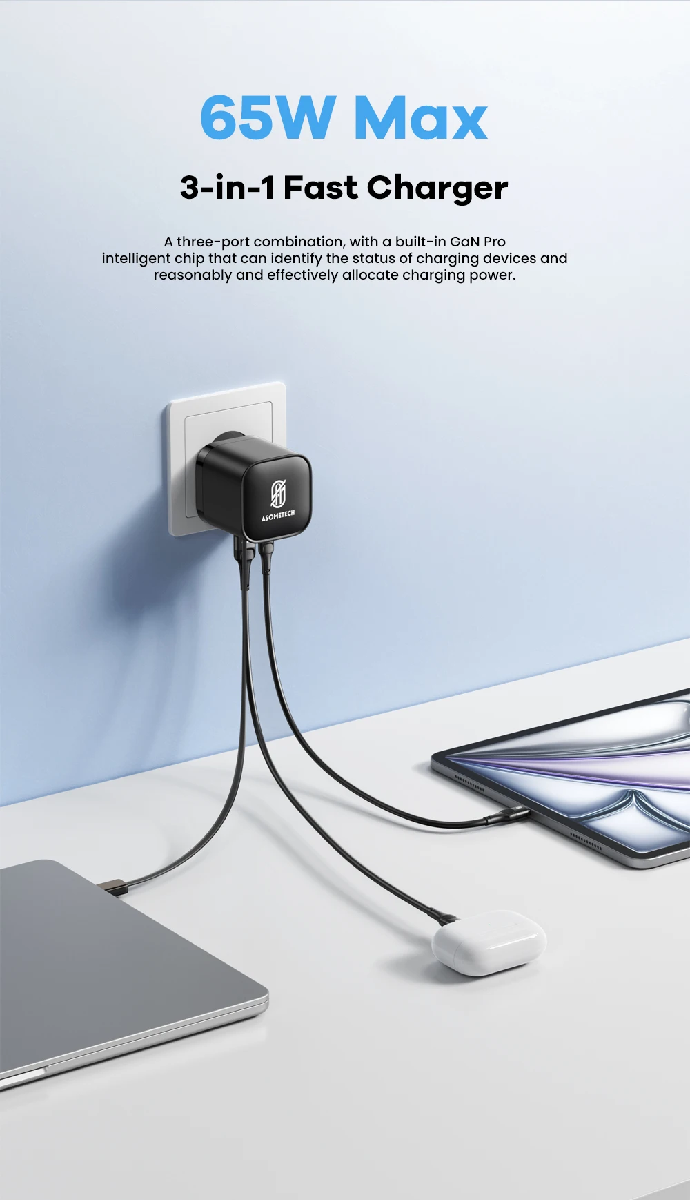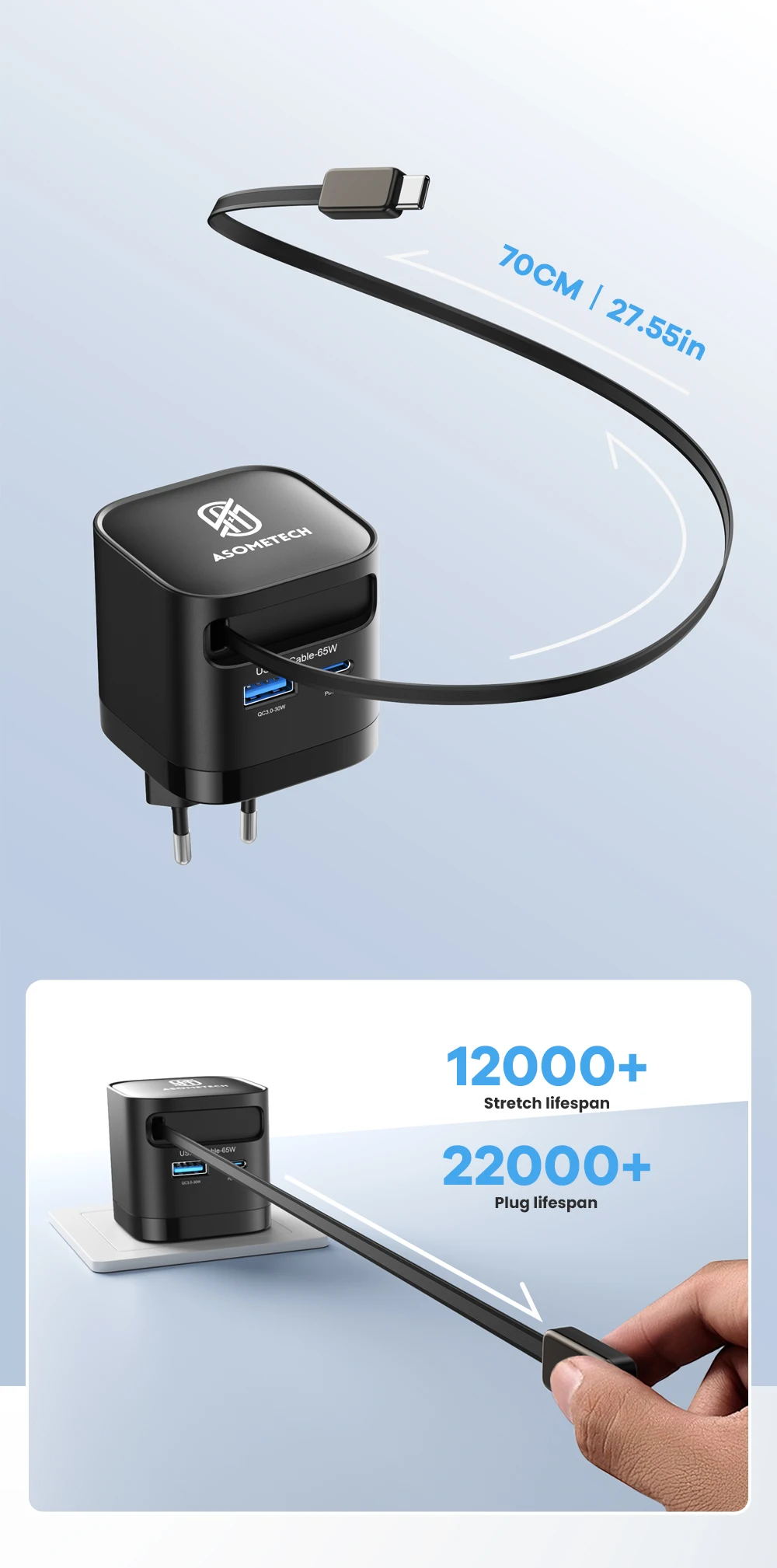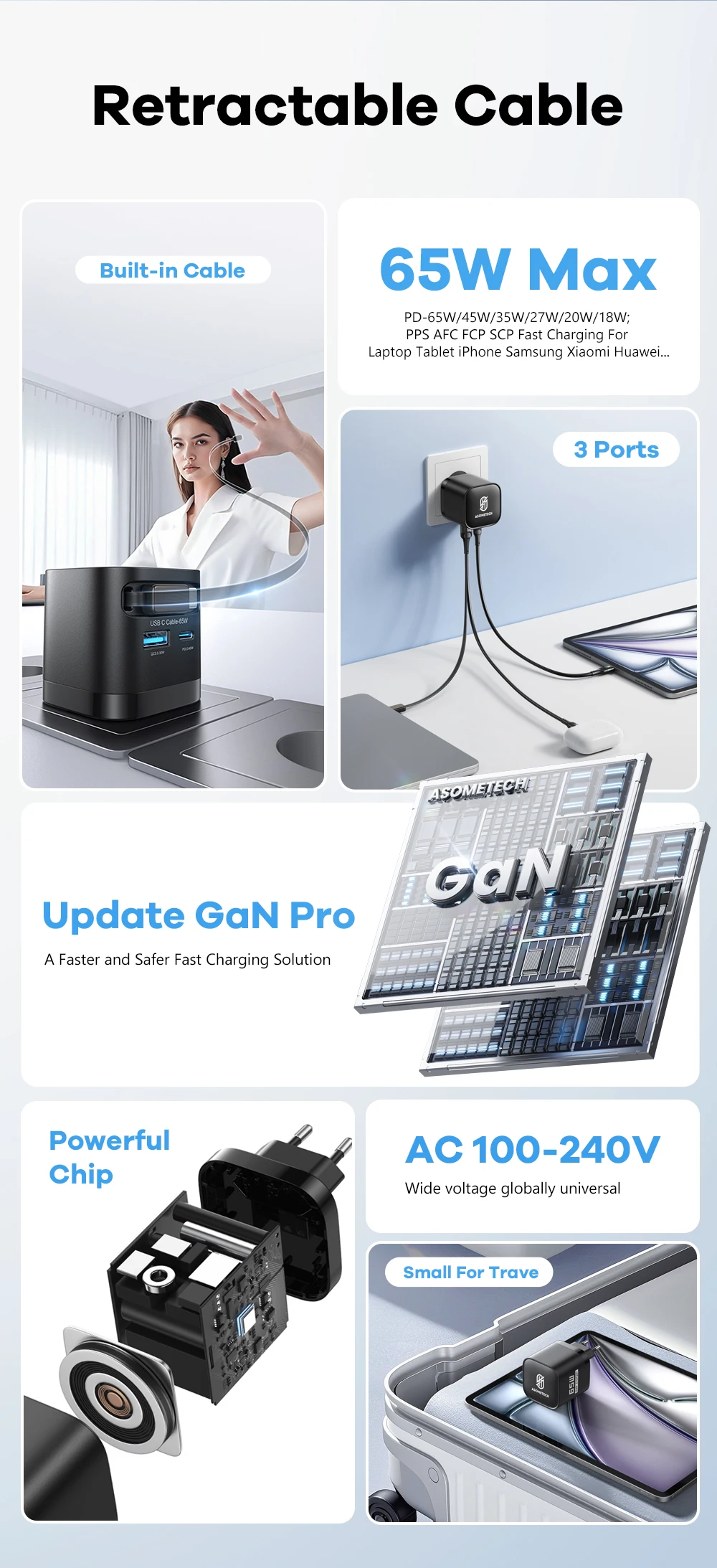 ASOMETECH Cargador USB GaN de 65 W con Cable retráctil Tipo C Cargador rápido de 3 puertos QC4.0 PD3.0 PPS para Macbook Laptop iPhone 16 15 14 Xiaomi