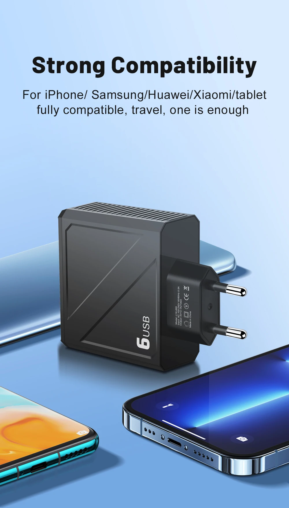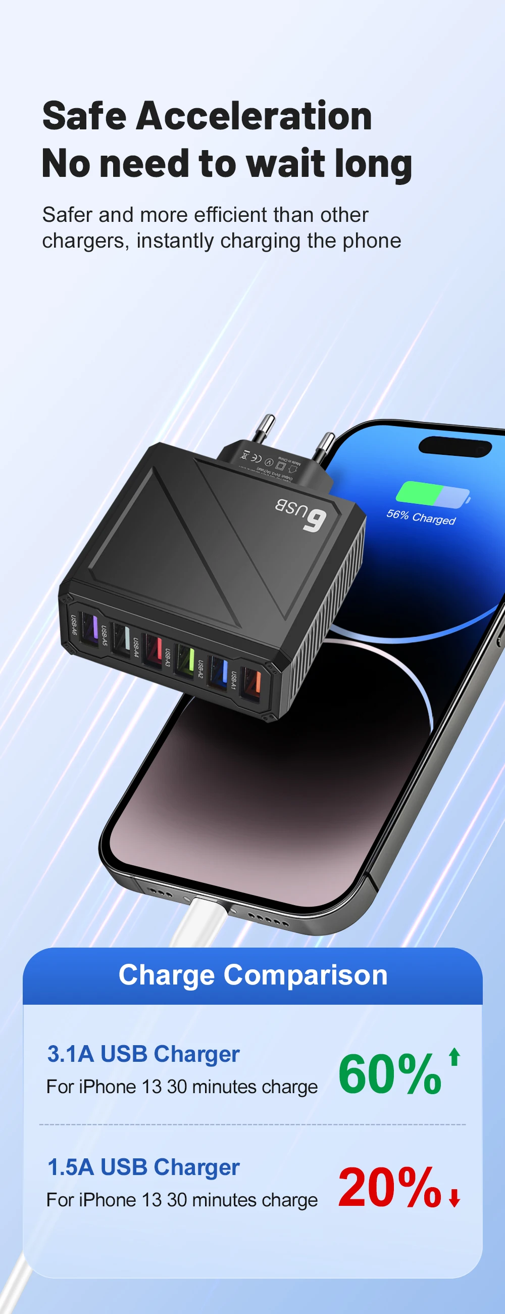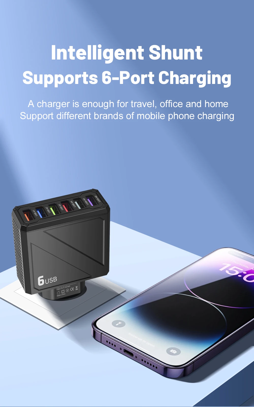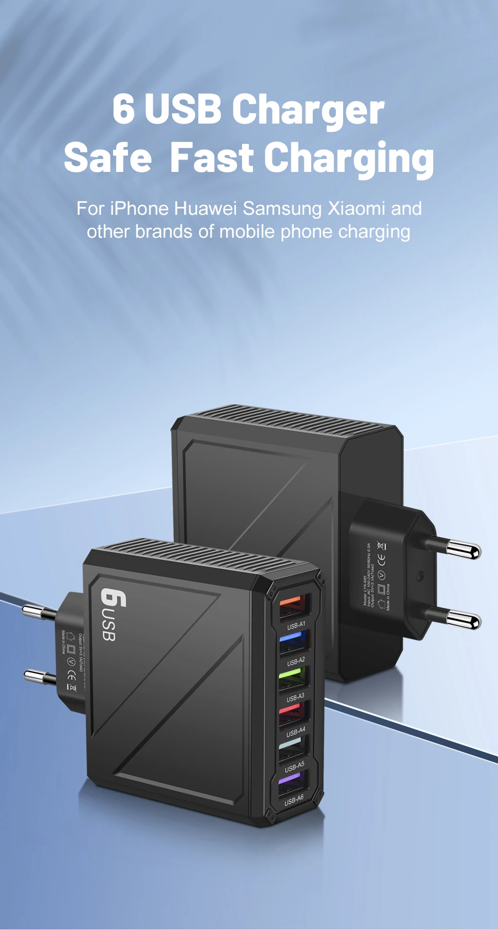 Cargador USB multipuerto 3,1A, cargador de pared de carga rápida de 6 puertos, carga rápida para iPhone, Samsung, Xiaomi, Huawei, adaptador de teléfono móvil