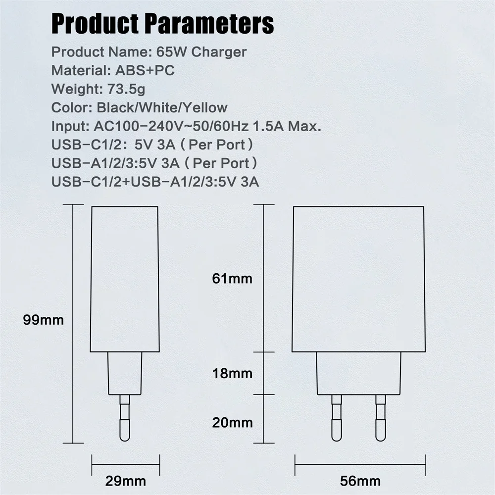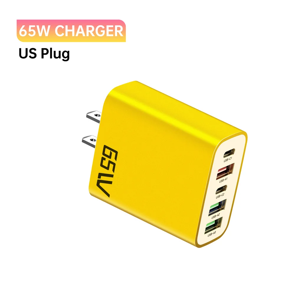 Cargador USB multipuerto de 65W, adaptador de cargador de teléfono tipo C de carga rápida para iPhone Xiaomi Samsung, 5 puertos, cargador de pared con enchufe UE/EE. UU.