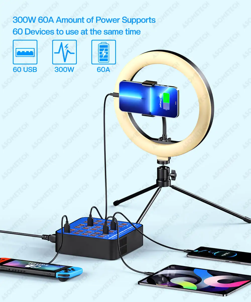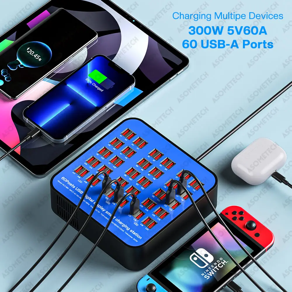 Comprar Cargador USB portátil de 300W y 60 puertos, estación de carga multipuertos para Iphone 12, 13 Pro Max, Xiaomi, Ipad, tableta y Samsung