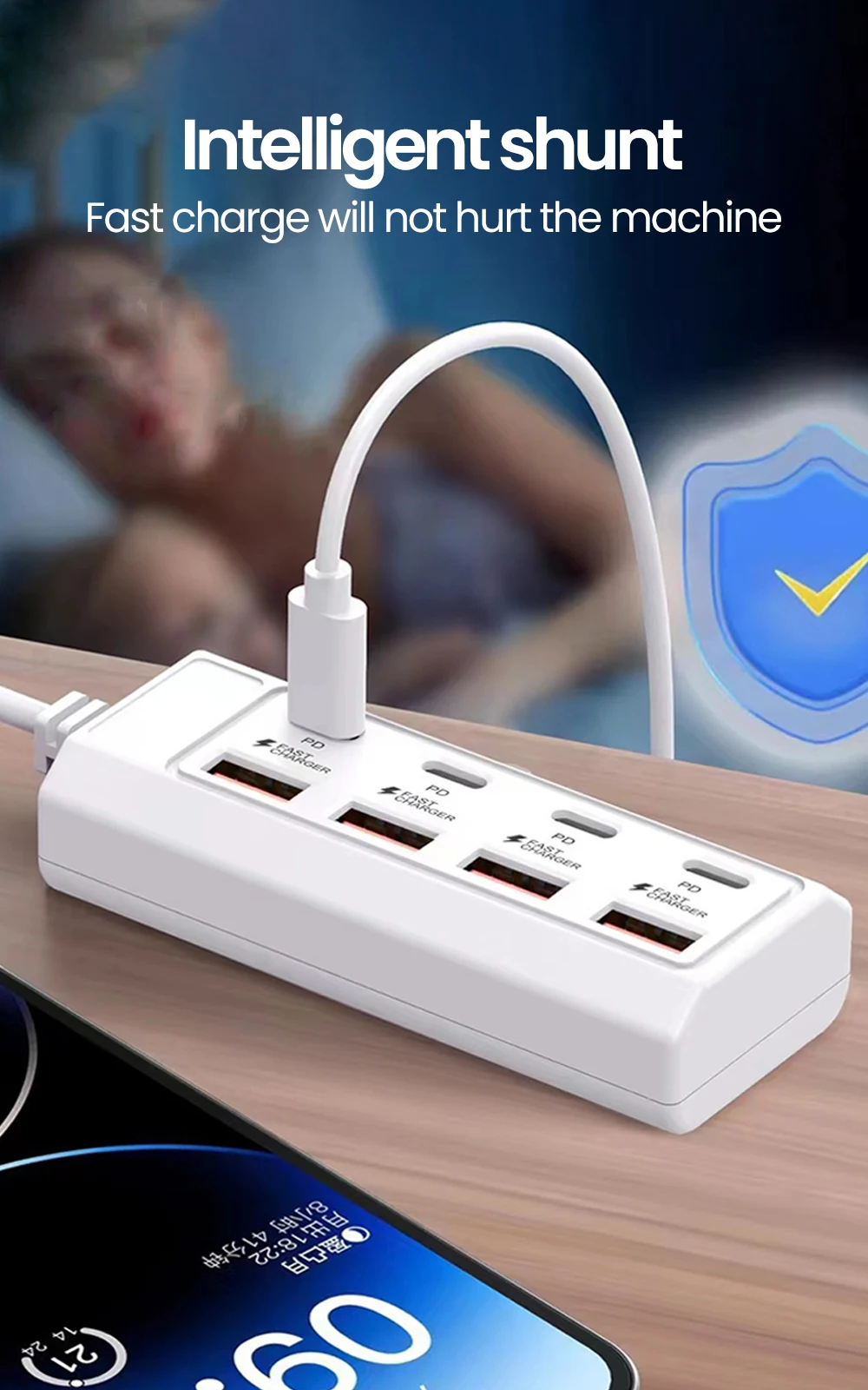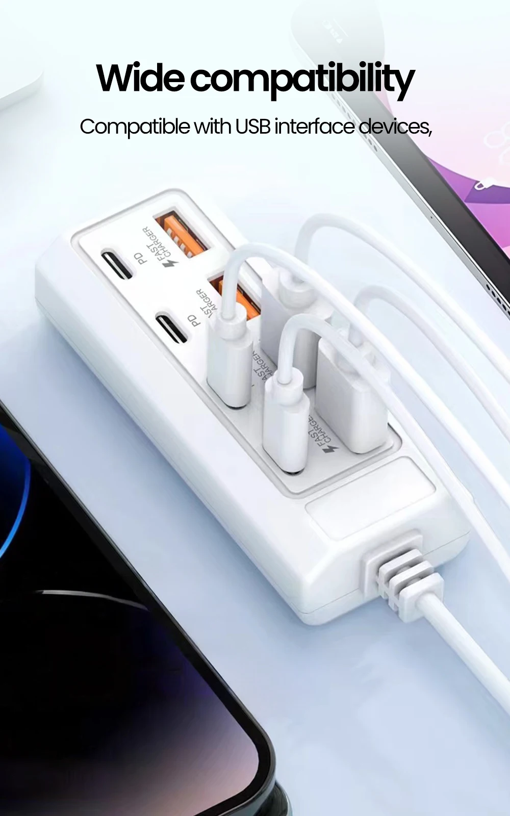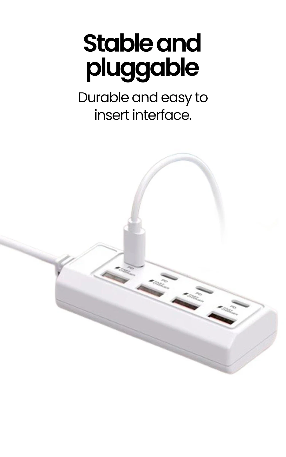 Este convertidor cuenta con cuatro puertos USB y cuatro puertos PD (Power Delivery), lo que le permite cargar hasta ocho dispositivos al mismo tiempo, lo que lo convierte en una solución ideal para hogares y oficinas con múltiples dispositivos.