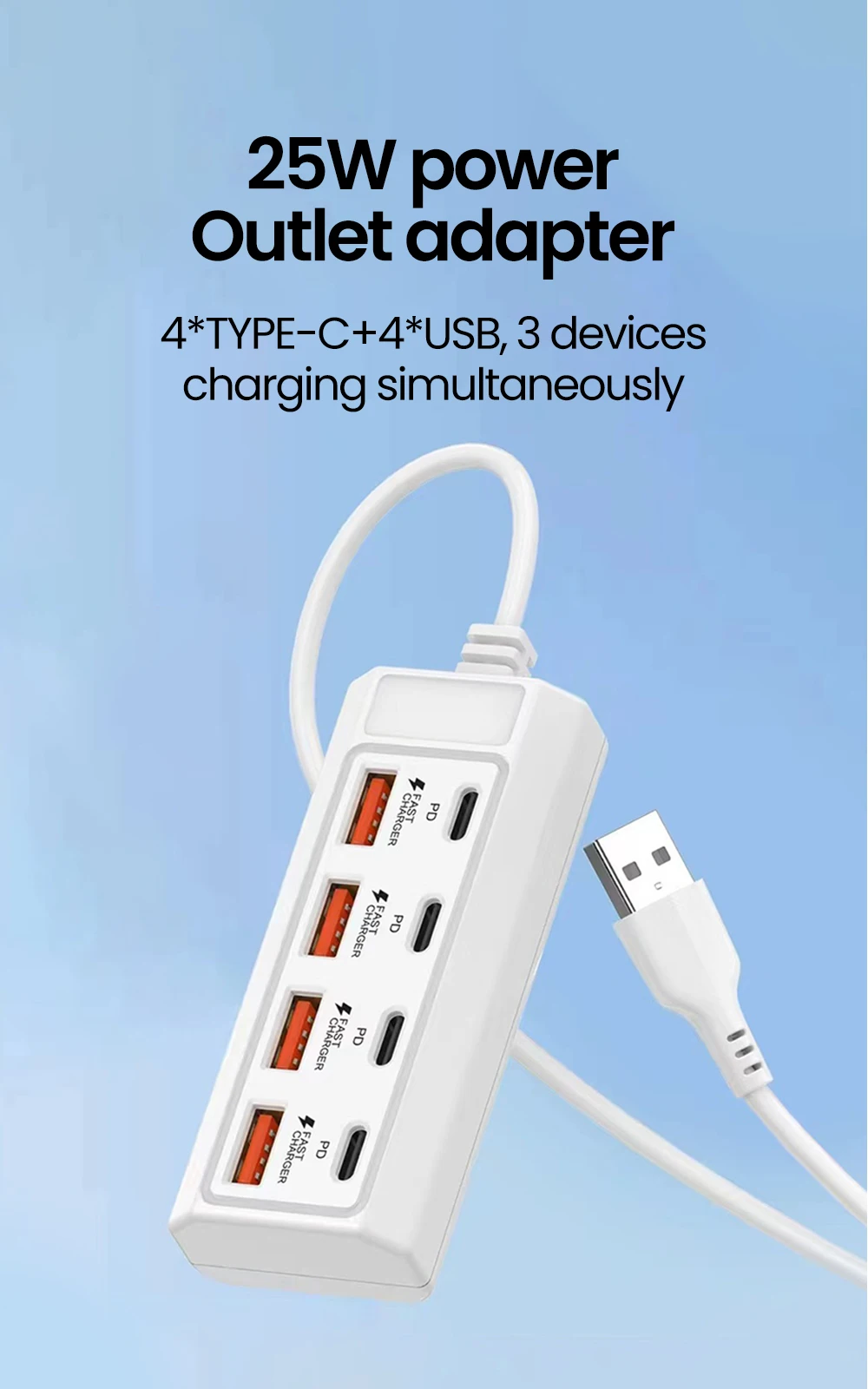 Cargador USB de 25W y 8 puertos, cargador de pared tipo C, USB, MultiPort, carga rápida, enchufe de viaje, adaptador Universal de teléfono para teléfono móvil