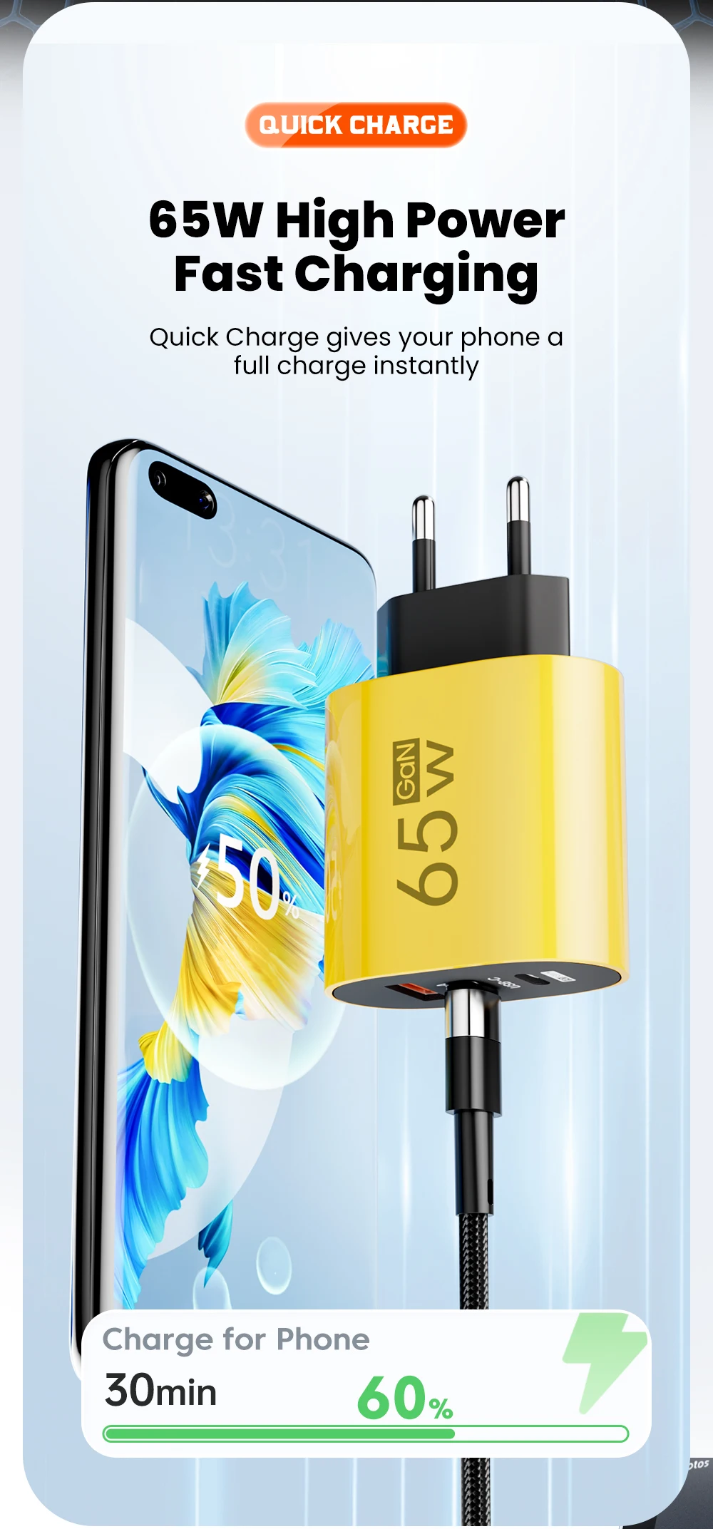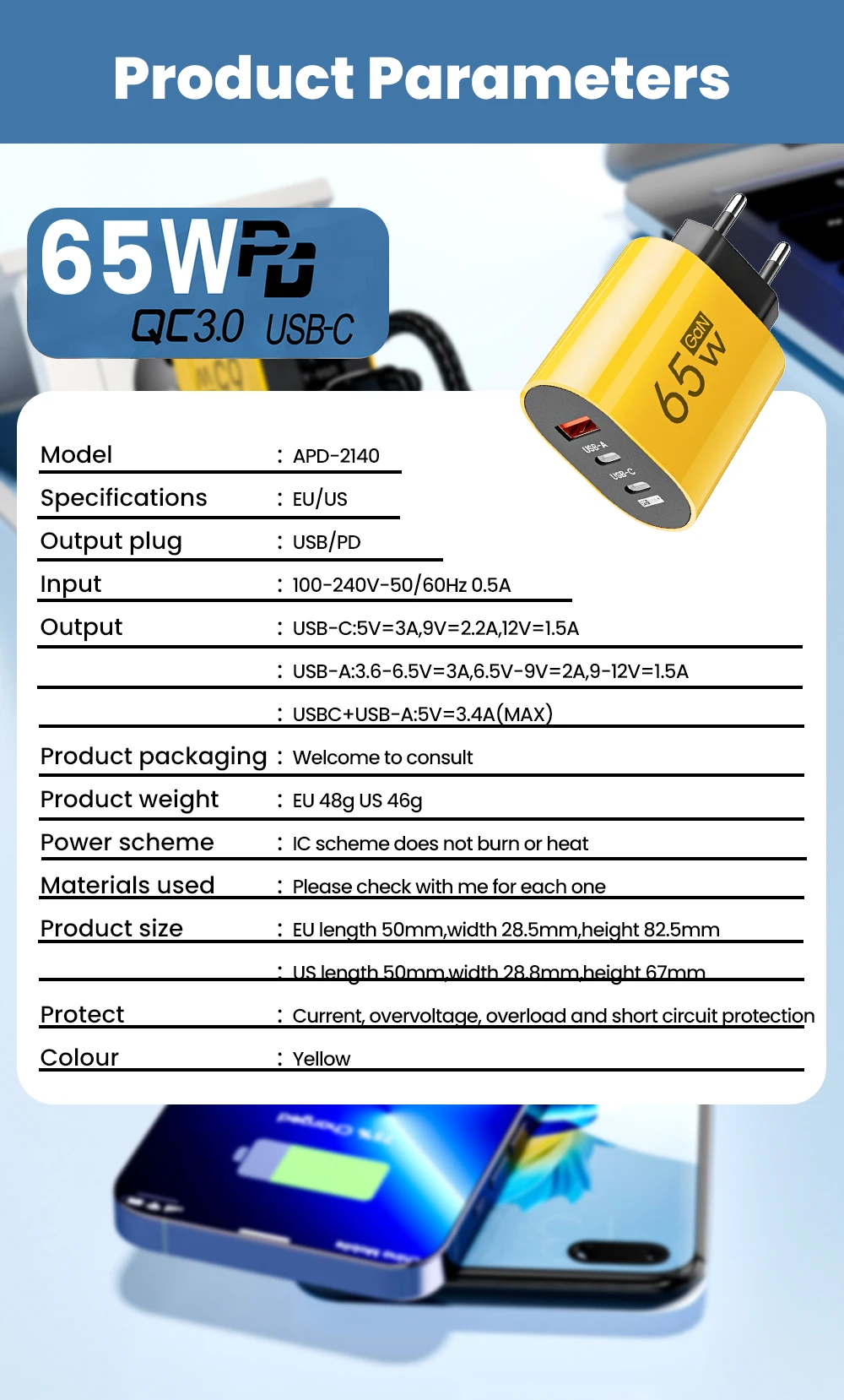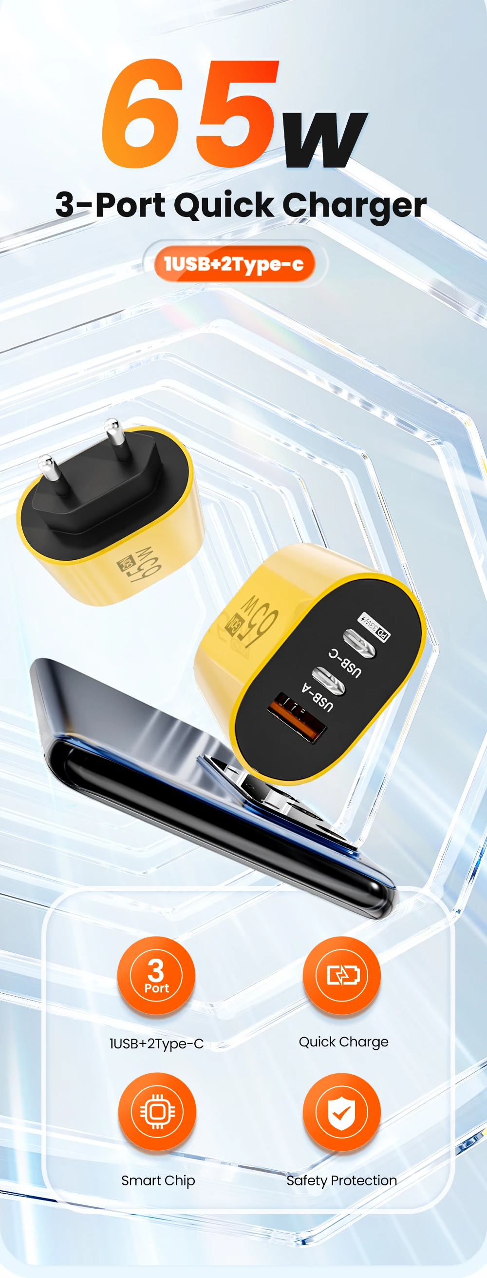 Cargador USB tipo C de 3 puertos 65W PD QC3.0 cargador de pared adaptador de carga rápida para iphone Xiaomi Samsung Huawei cargador USB C