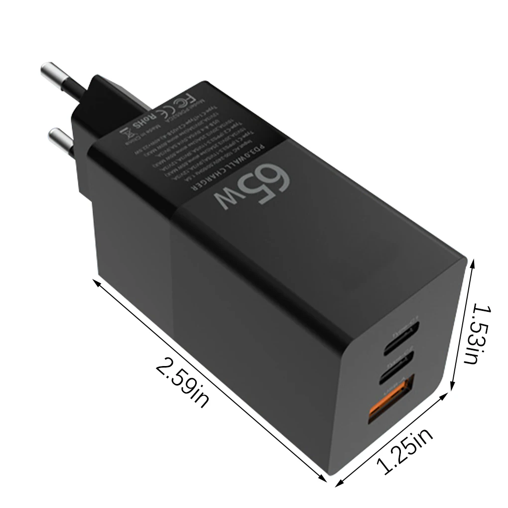 Este tipo de cargador es adecuado para teléfono, ordenador portátil, máquina de juegos y otros dispositivos, y puede cargar rápidamente, ahorrando tiempo para usted.Este adaptador de carga está diseñado con 3 conectores que son 2 conectores tipo C y 1 Conector USB, conveniente para cargar 3 dispositivos a la vez.El cargador está hecho de plástico y material ignífugo, que es duradero y seguro de usar, puede usarlo durante mucho tiempo sin romperse.Están diseñados con protección contra cortocircuitos, sobrecargas y calor, asegurando la seguridad de su carga, puede usarlo sin preocuparse por dañar su dispositivo.El cargador USB tipo C está diseñado con un tamaño pequeño y ligero que es conveniente para almacenar y transportar, no ocupará mucho espacio.Especificación:Material: ABS + PC material ignífugo.Color: negro.Tamaño: 3, 9X10X3.2cm.Acuerdos cubiertos: QC4.0, QC3.0, PD, PD 3,0.Conector: 2 conectores tipo C y 1 Conector USB.Salida: 5V/3A, 9V/3A, 12V/3A, 20V/3A.Voltaje: CA 100-240V 50 / 60Hz.Potencia total de salida: 65W.Potencia tipo C 1 y tipo C 2: 40W + 22,5 W.Tipo C 1 y alimentación USB: 40W + 22,5 W.Tipo-c 2 y alimentación USB: 13W + 13W.Paquete incluido:1x cargador.