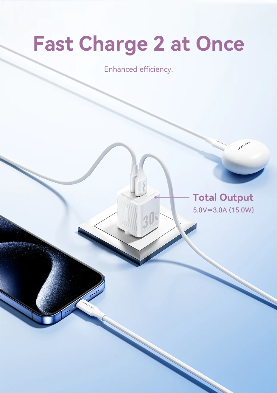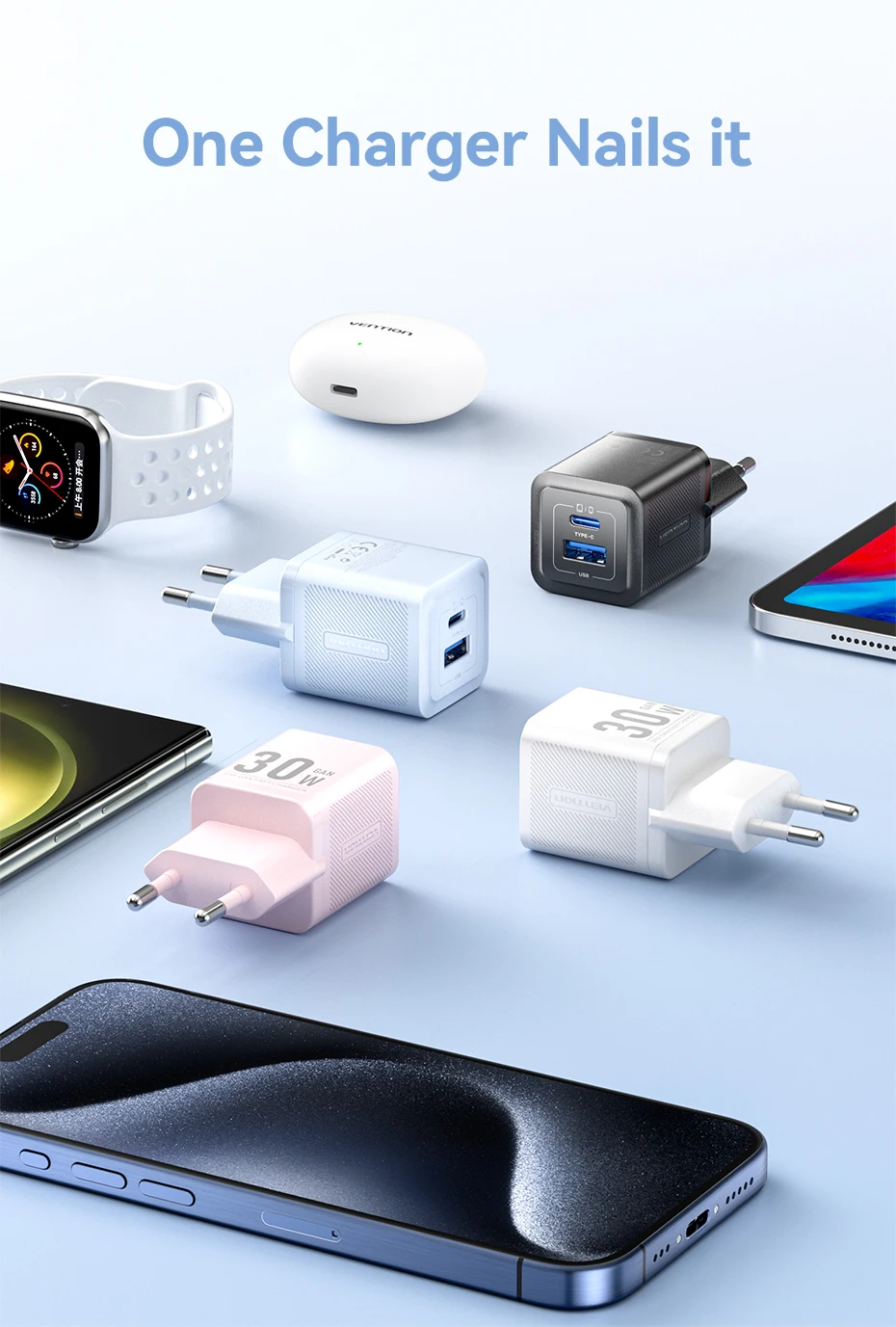 Cargador Vention 30W GaN PD para iPhone 15 14 13 12 11 Xs Max cargador rápido PD3.0 QC3.0 cargador de teléfono tipo C carga de tabletas
