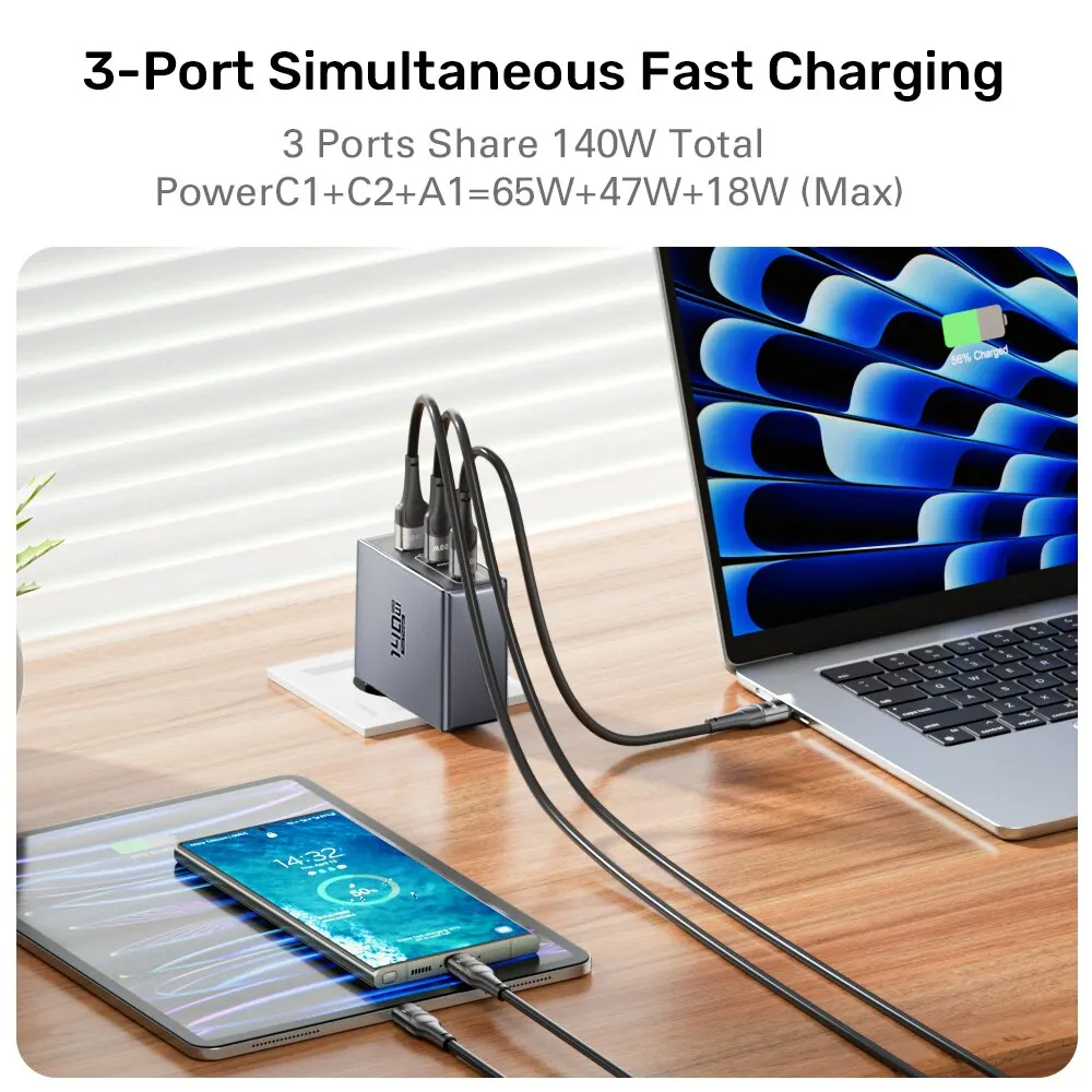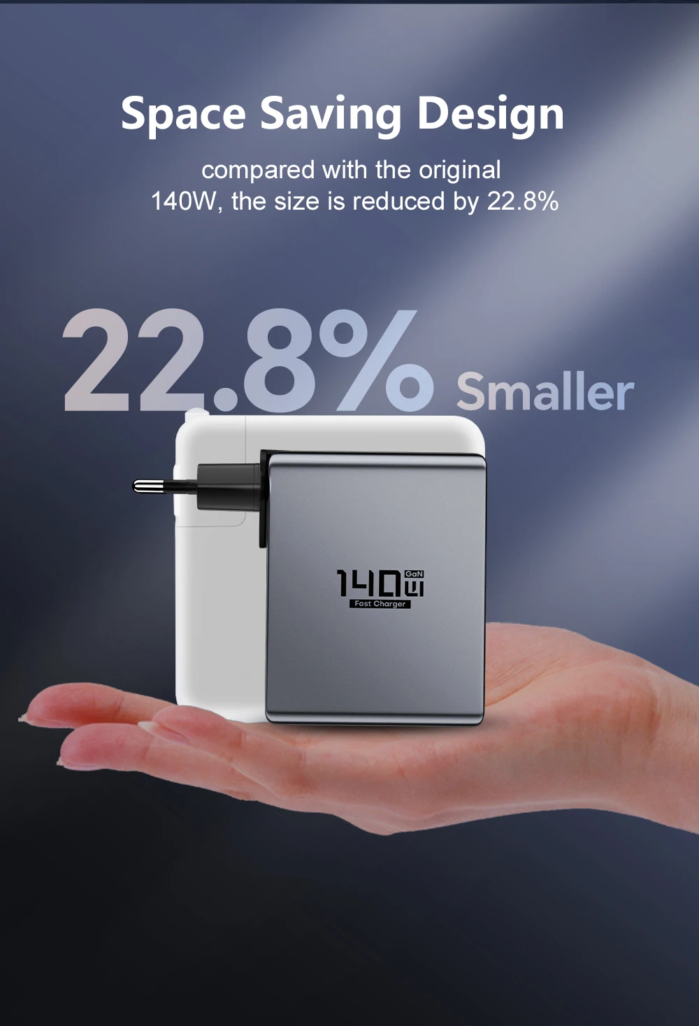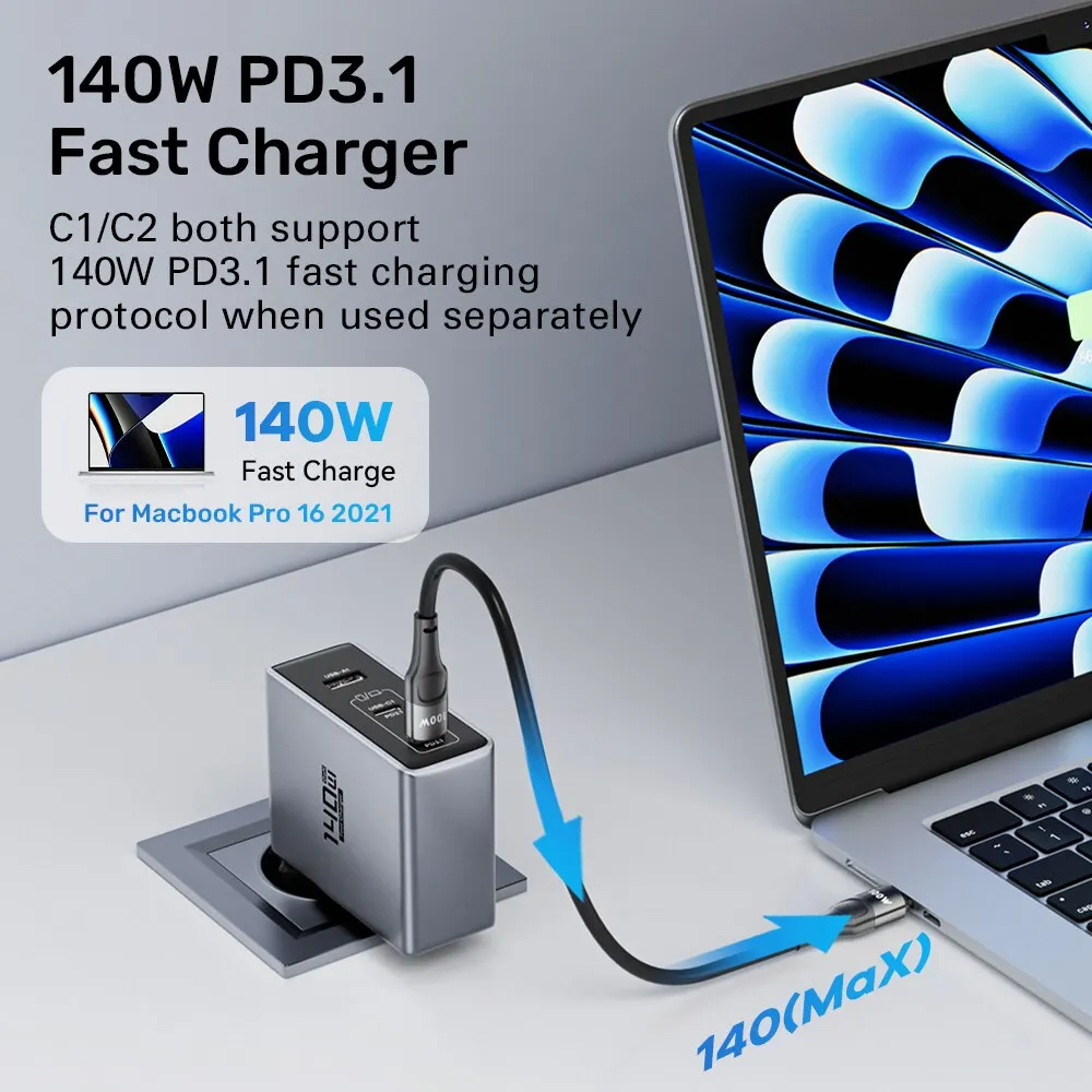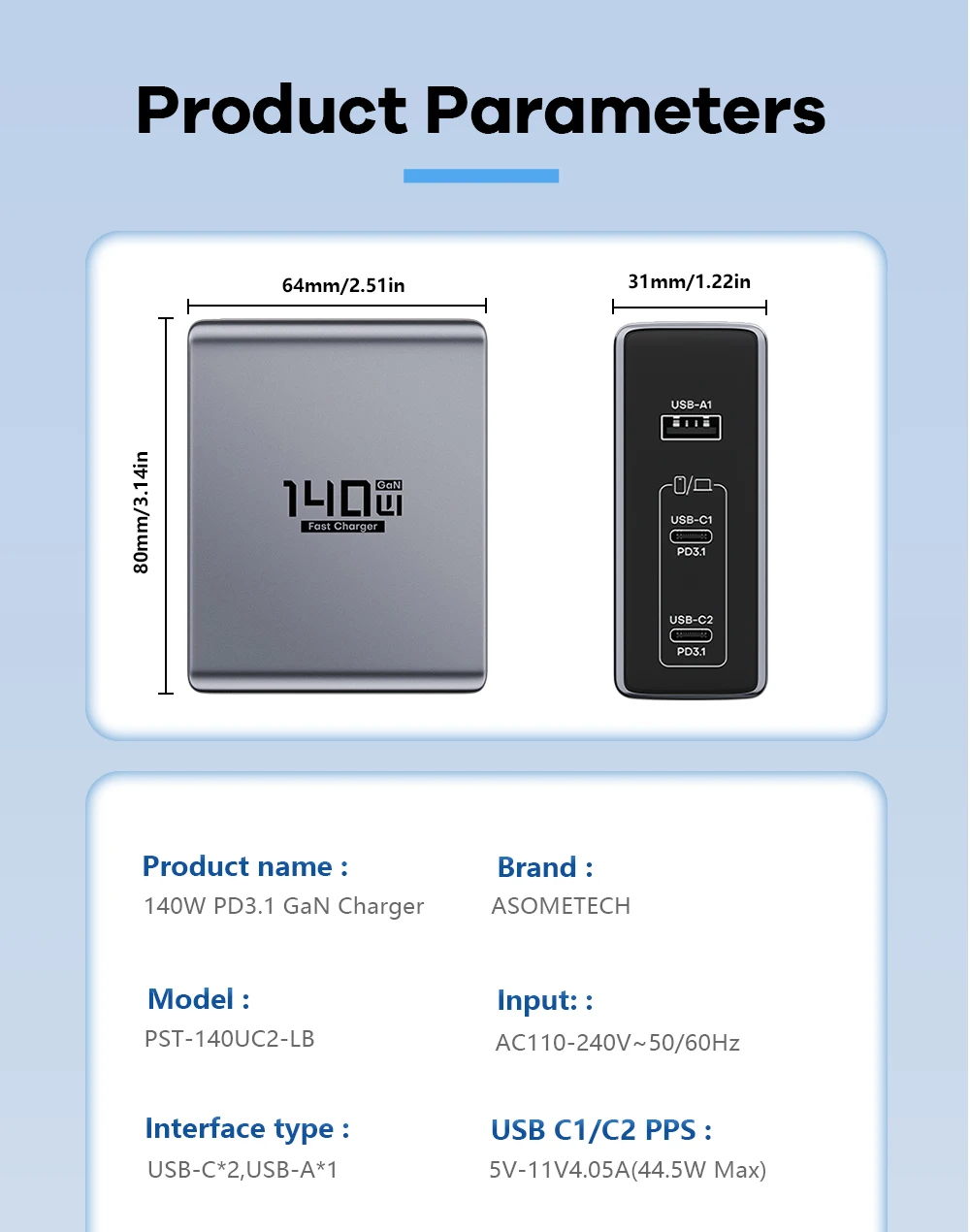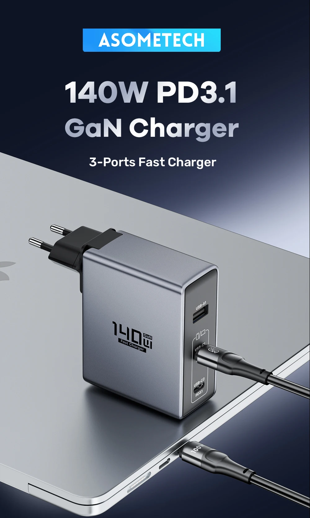 Cargador GaN PD3.1 ASOMETECH de 140W y 3 puertos