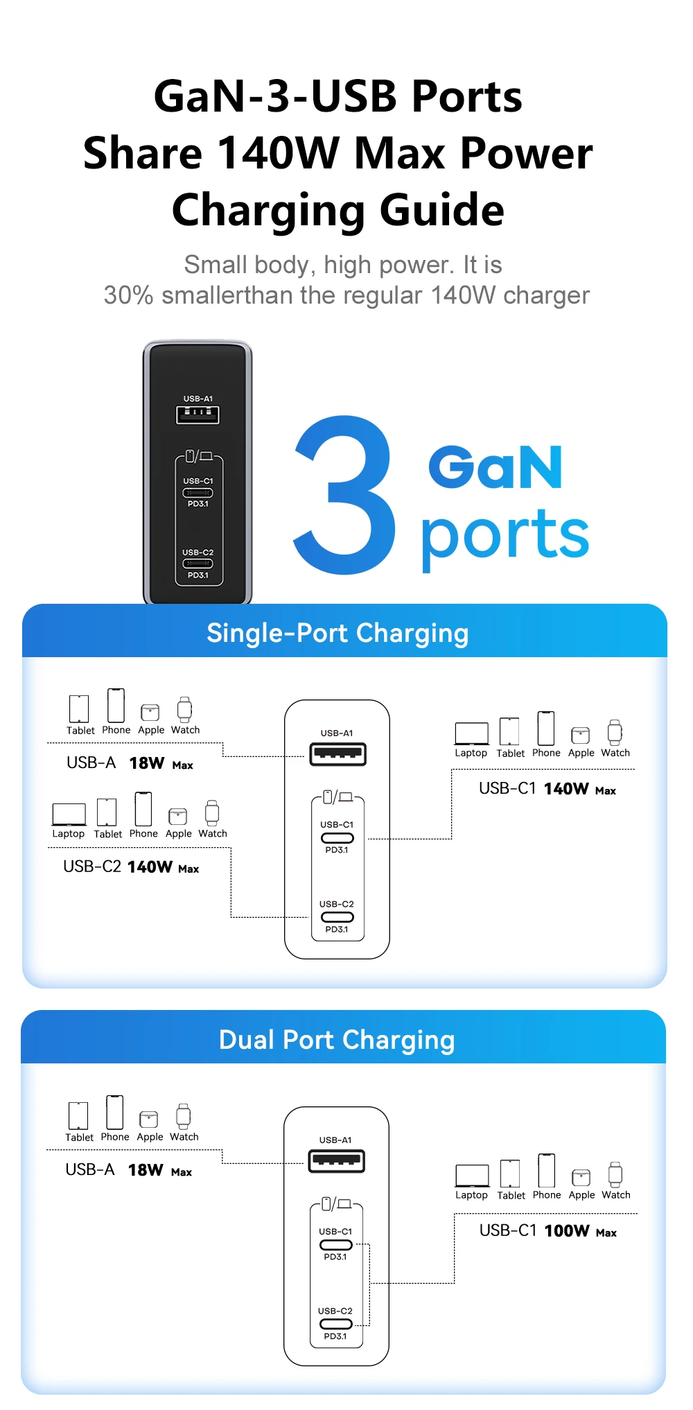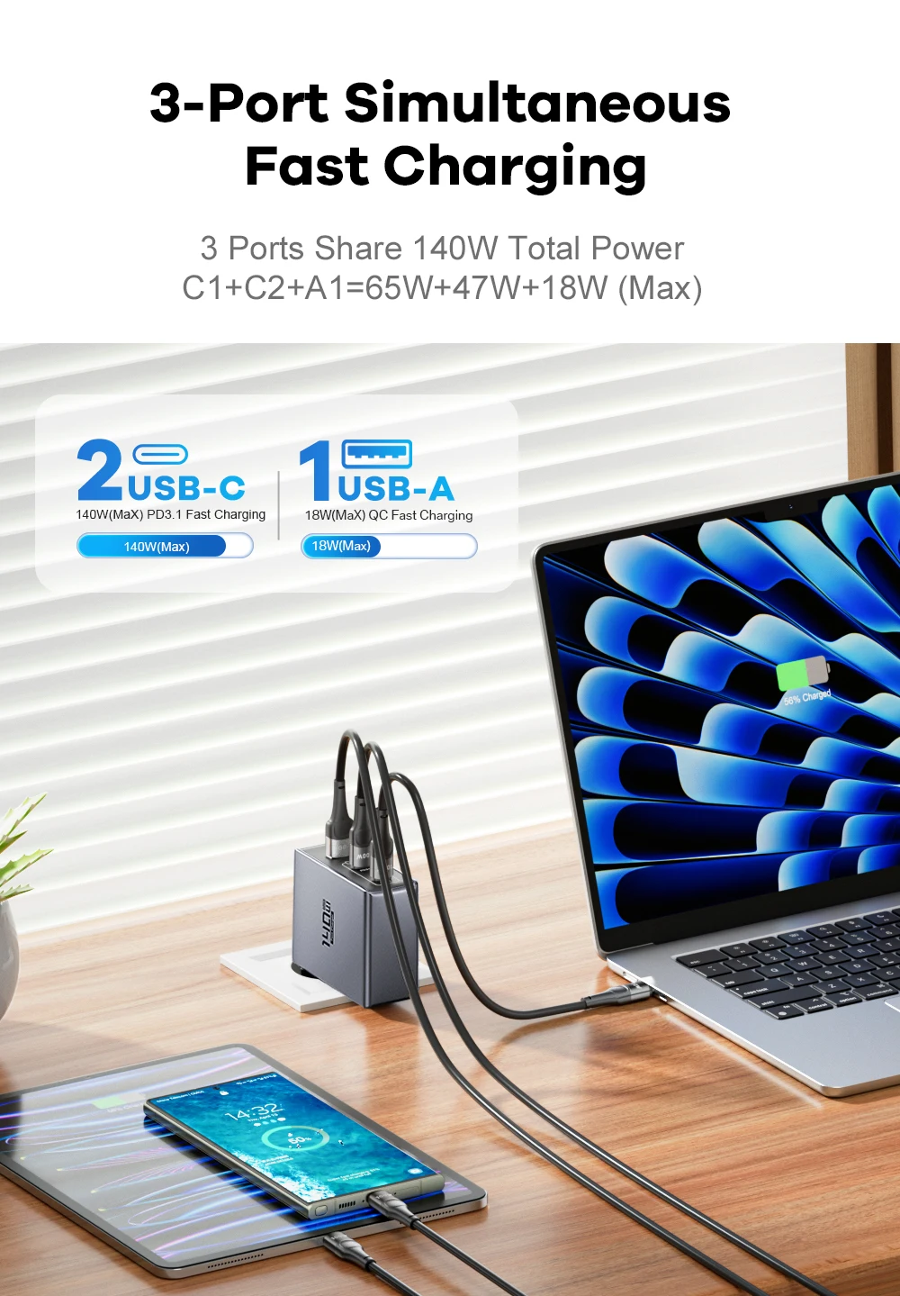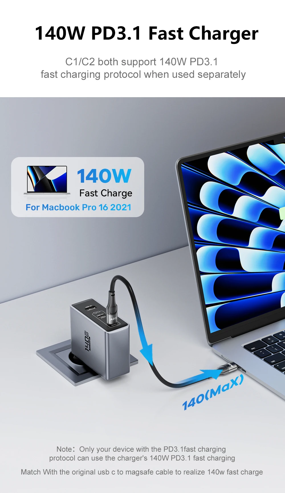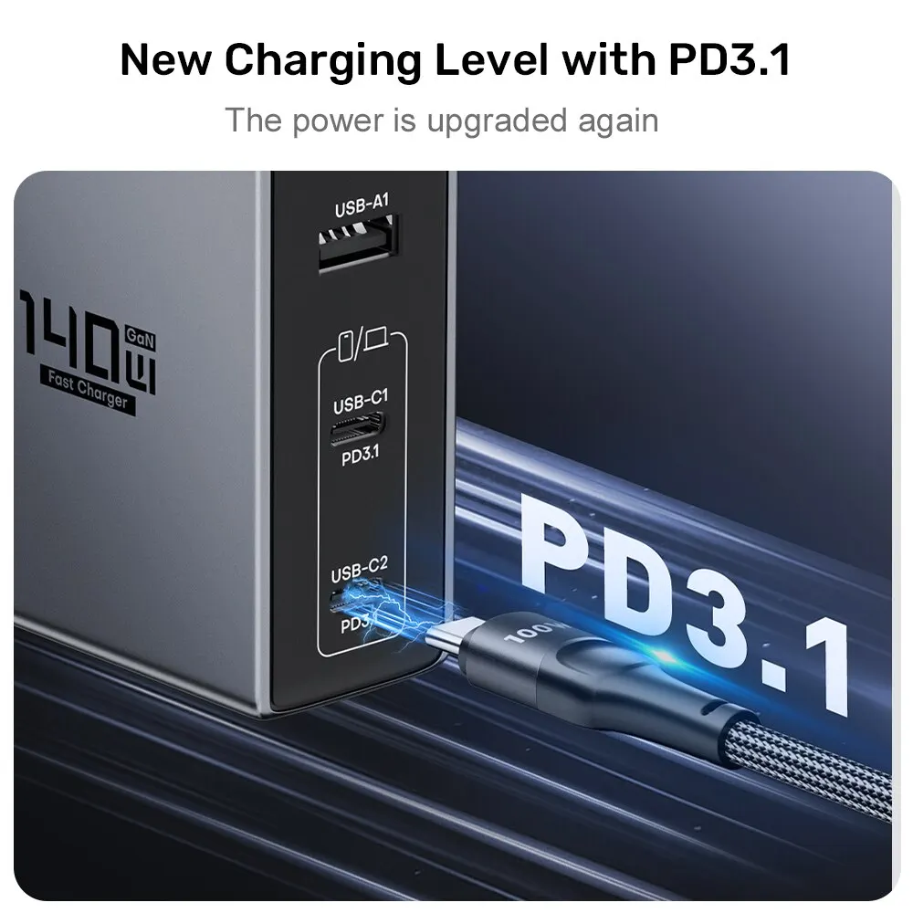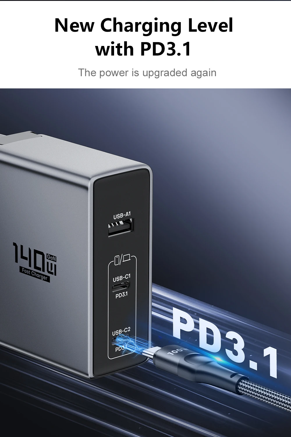 La carga rápida PD3.1 de 140 W solo admite dispositivos con protocolo de carga rápida PD3.1 y requiere un cable de carga que admite carga rápida PD3.1 de 140 W