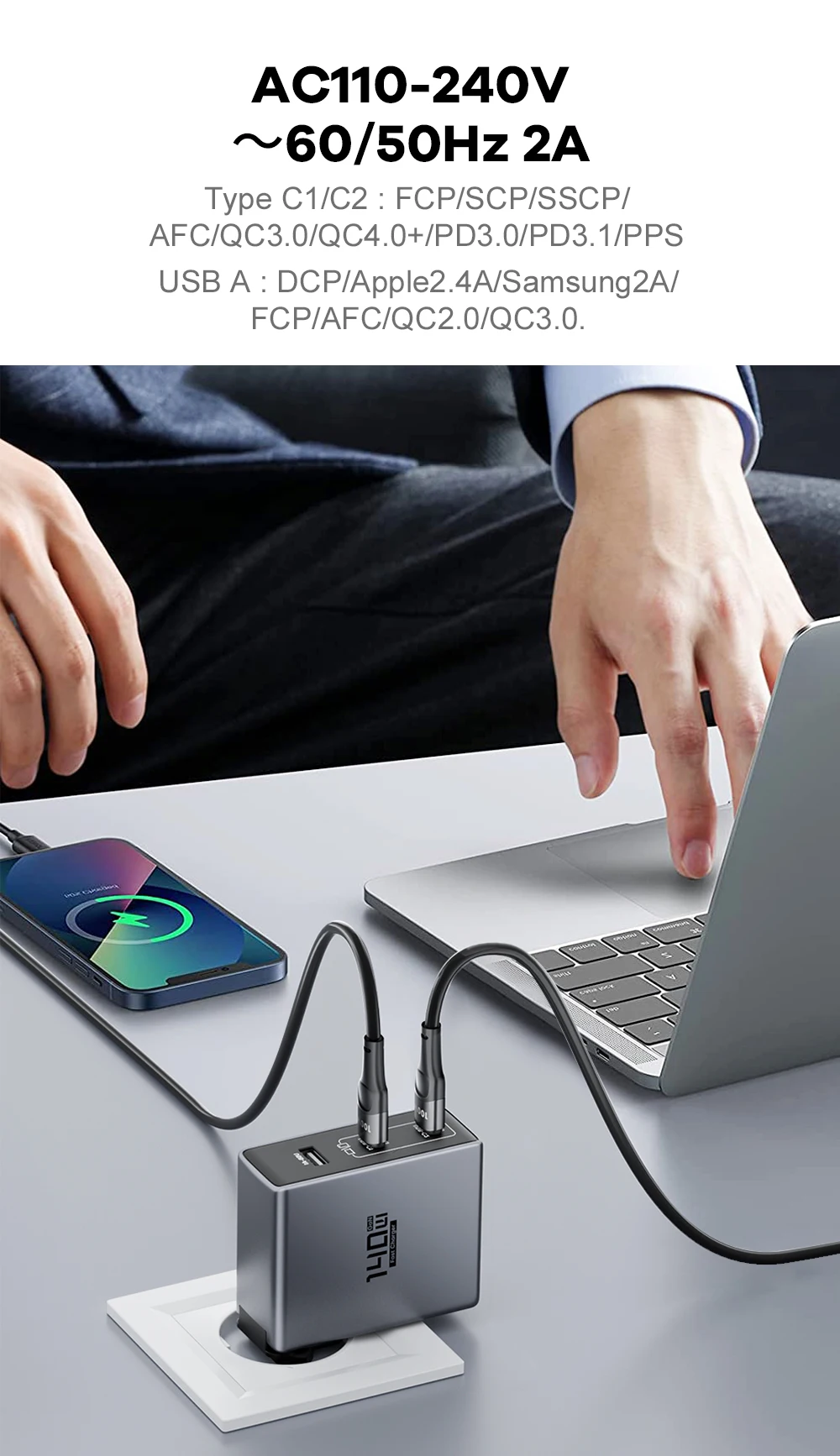 ⚡Salida USB-C1/C2: 5v3a 9v3a 12v3a 15v3a 20v5a 28v5a (pd3.1 140W máx.);