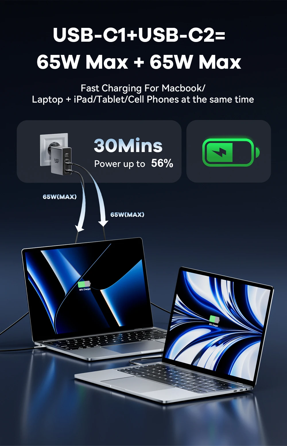 C1+C2=65W+65W (salida C1/C2 DC5V,9V,12V,15V,3A/20V,3,25A (PD3.0 65W),PPS:5-11V/4,05A);