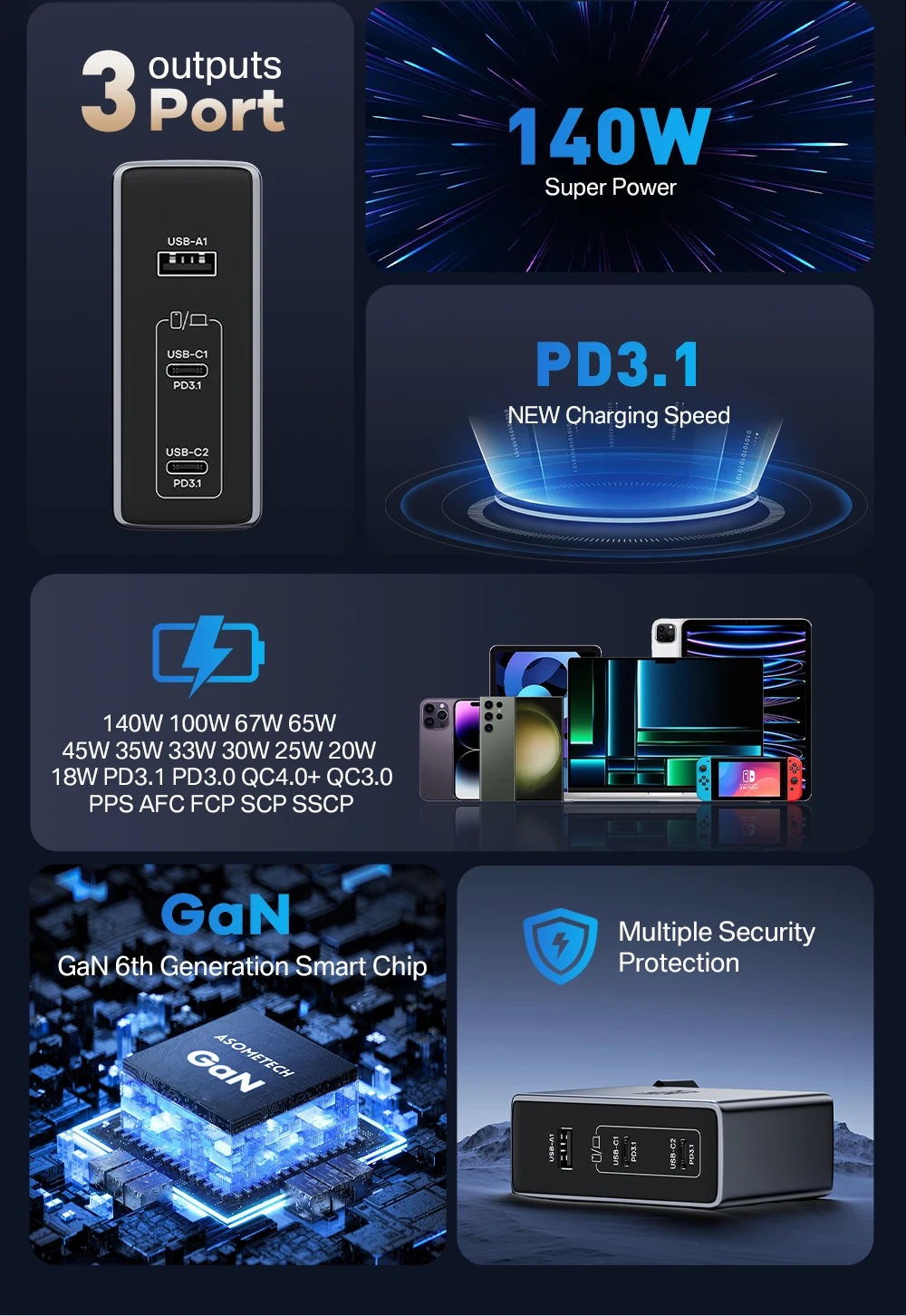 Comprar Cargadores ASOMETECH 140W GaN PD3.1 PPS QC4.0 100W 65W PD USB tipo C cargador rápido para ordenador portátil Macbook Pro iPhone 14 Samsung