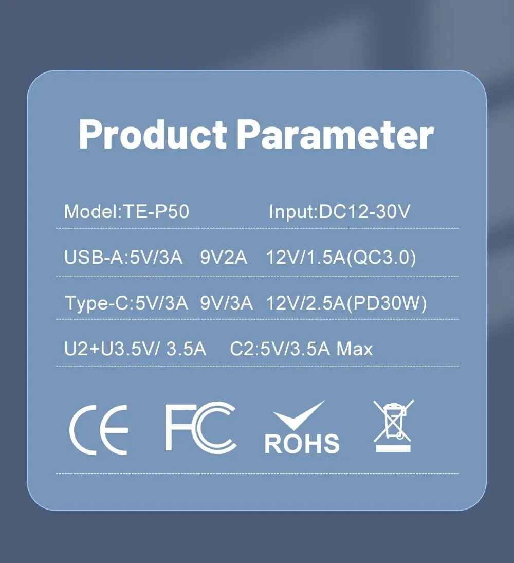 USB-A 5V 3A 9V 2A 12V 1.5A (QC30W)