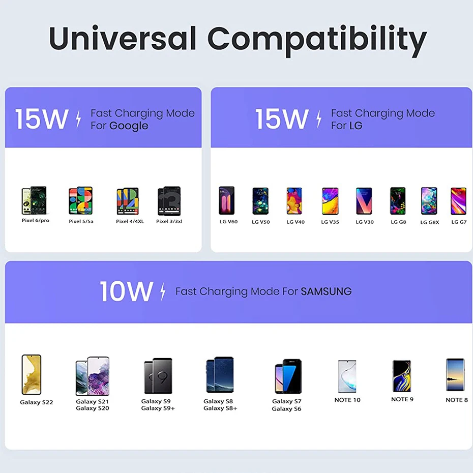 Esta plataforma de carga inalámbrica admite 4 tipos de esquemas de potencia de salida: 15W/10W/7,5W/5W.Diferentes dispositivos se adaptarán automáticamente a diferentes potencias de salida, compatible con iPhone 7,5 W (máx.) / Samsung 10 W/15 W (máx.), con tecnología de protección inteligente integral para lograr una carga más rápida y segura.