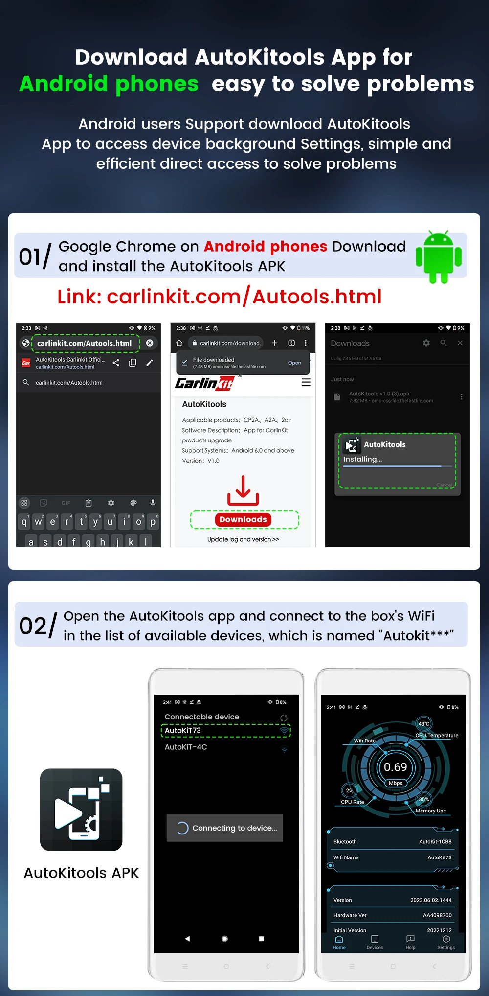 2 Abra la aplicación AutoKitools y conéctese al WiFi de la caja en la lista de dispositivos disponibles, que se llama "kit para automóvil ***"