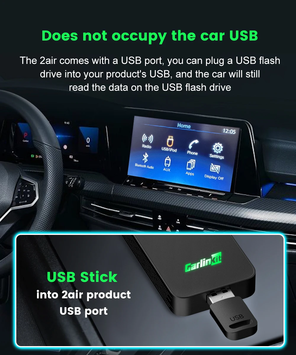 El 2air viene con un puerto USB, puede conectar una unidad flash USB al USB de su producto y el automóvil seguirá leyendo los datos en la unidad flash USB.