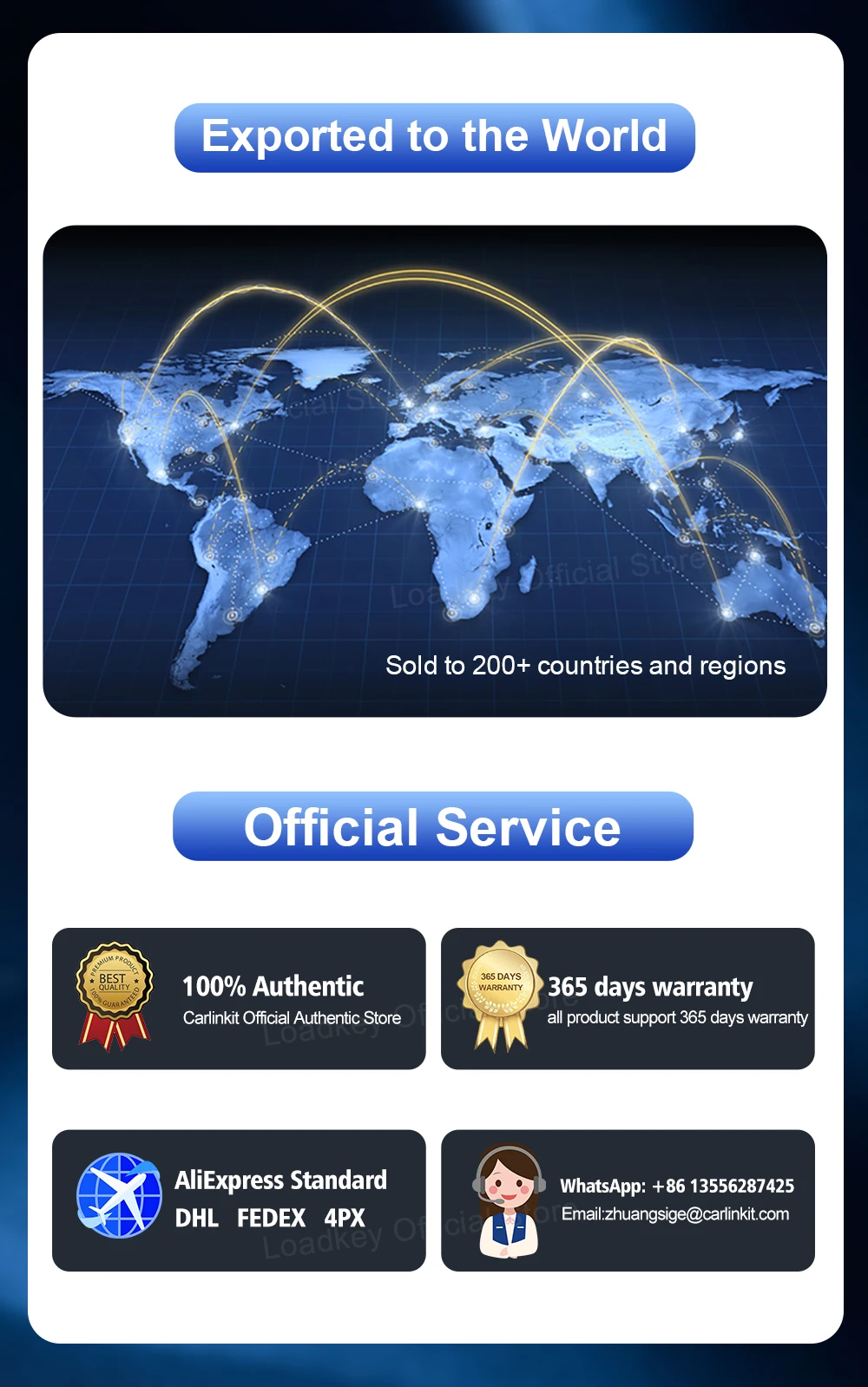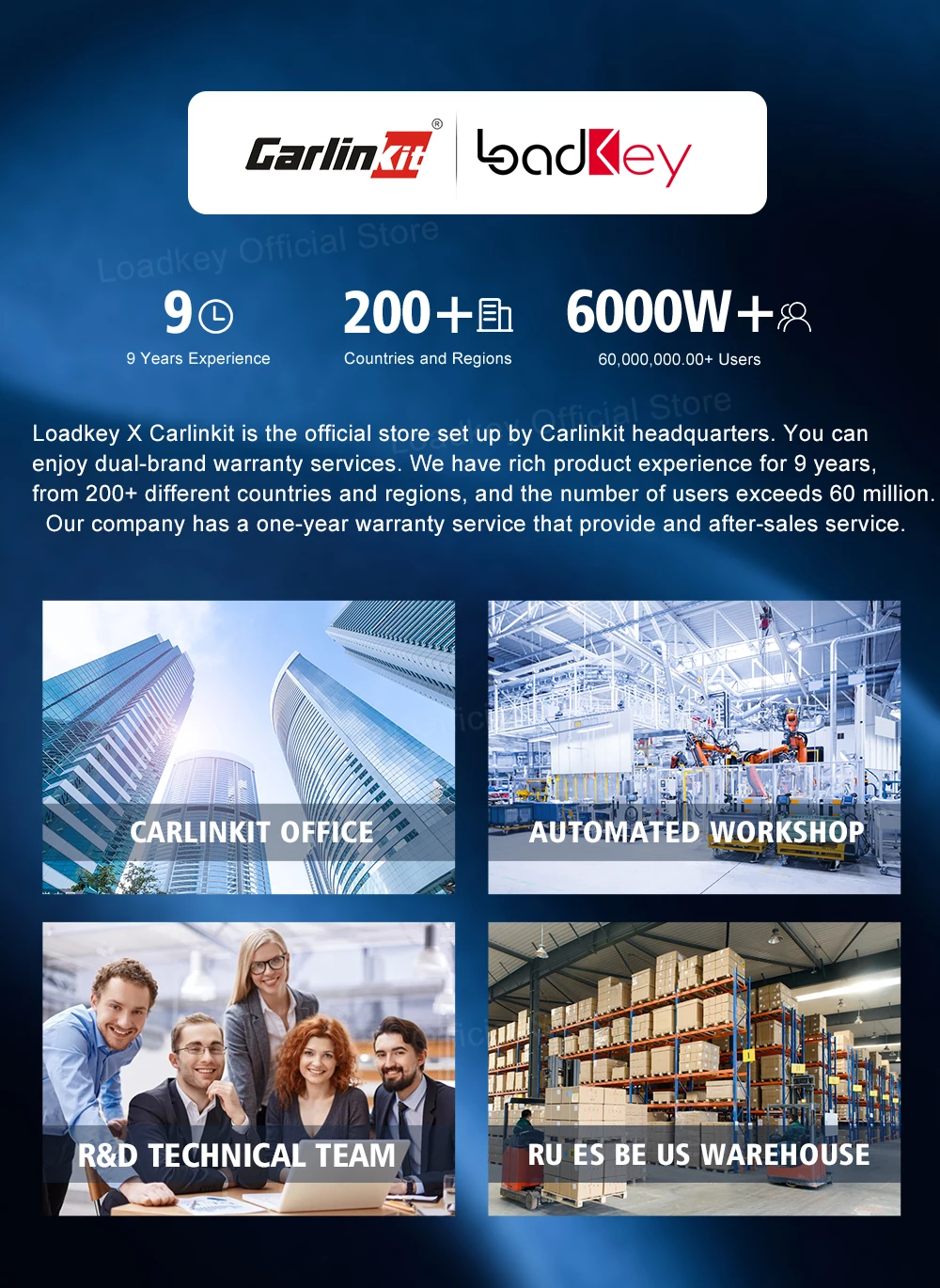 Loadkey X Carlinkit es la tienda oficial creada por la sede de Carlinkit. Puede disfrutar de servicios de garantía de doble marca. Tenemos una rica experiencia en productos durante 9 años, de más de 200 países y regiones diferentes, y el número de usuarios supera los 60 millones. La compañía tiene un servicio de garantía de un año que brindamos y servicio postventa. Se compromete a vender productos auténticos 100% originales.