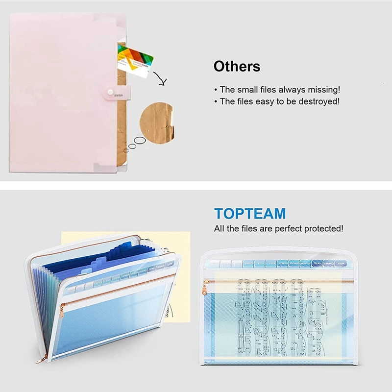 [Diseño de múltiples compartimentos]: 13 bolsillos individuales, adecuados para tamaño A4 y Carta, cada bolsillo se expande a 1 1/8 pulgadas (aproximadamente 3,8 cm), lo suficientemente seguro como para almacenar todos los artículos importantes sin atar todos los documentos juntos, lo suficientemente pequeño como para caber en la mochila. Es un buen ayudante para su vida de oficina.
