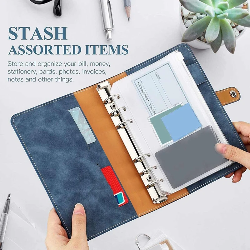 Carpeta de sobres de efectivo A6: para ayudarte a presupuestar y administrar las finanzas fácilmente. La Carpeta para cuaderno A6 está diseñada con 6 agujeros preperforados, resistentes para insertos de carpeta estándar A6. Incluye 1 portalápices, 2 ranuras para tarjetas, dos bolsillos para efectivo, además de un cierre a presión sólido para un cierre seguro.