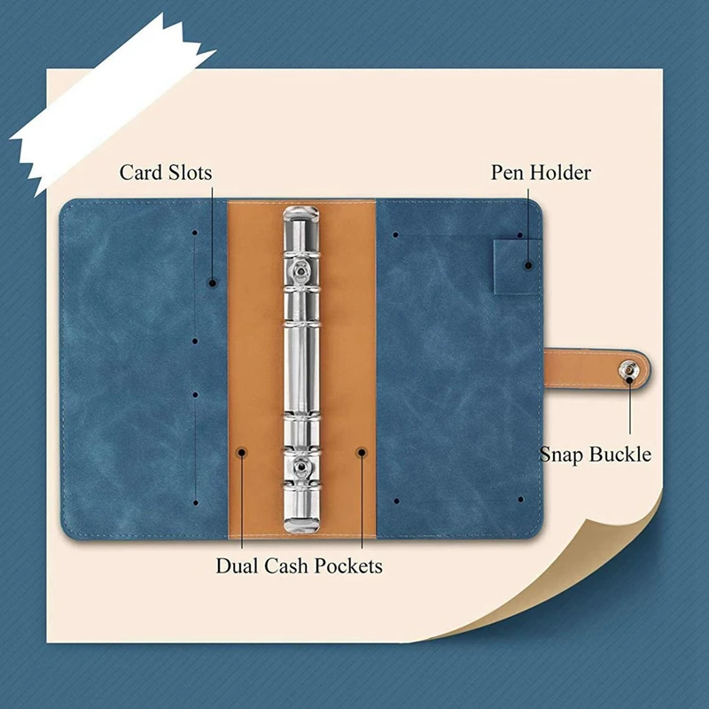 Carpeta de sobres de efectivo A6: para ayudarte a presupuestar y administrar las finanzas fácilmente. La Carpeta para cuaderno A6 está diseñada con 6 agujeros preperforados, resistentes para insertos de carpeta estándar A6. Incluye 1 portalápices, 2 ranuras para tarjetas, dos bolsillos para efectivo, además de un cierre a presión sólido para un cierre seguro.