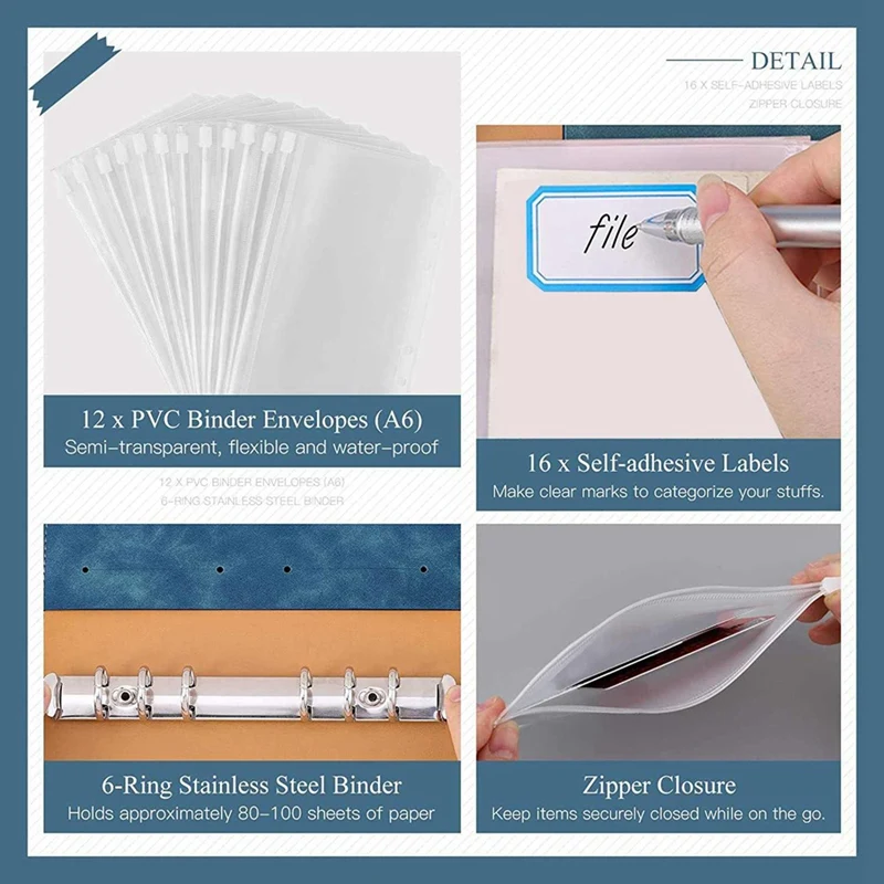 Almacenamiento versátil: La carpeta de cuaderno de 6 anillas viene con 12 bolsas de carpeta translúcidas con cremallera, Perfectas para almacenar facturas, efectivo, cupones, tarjetas, sellos, tarjetas de visita, tarjetas de crédito, y más. Además, con 16 etiquetas autoadhesivas, puede clasificar cada bolsa de carpeta.