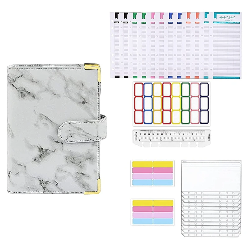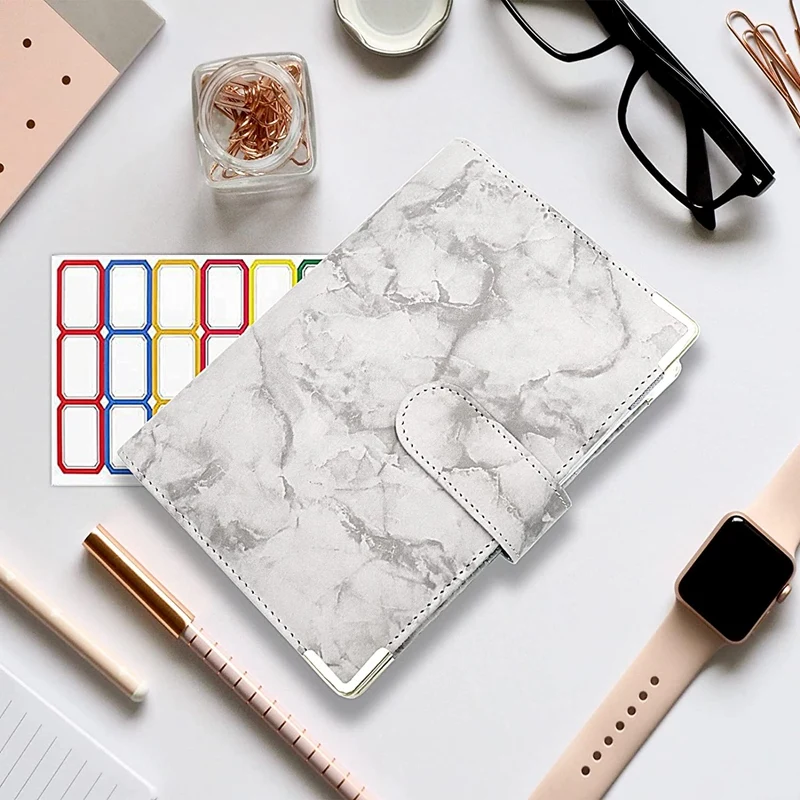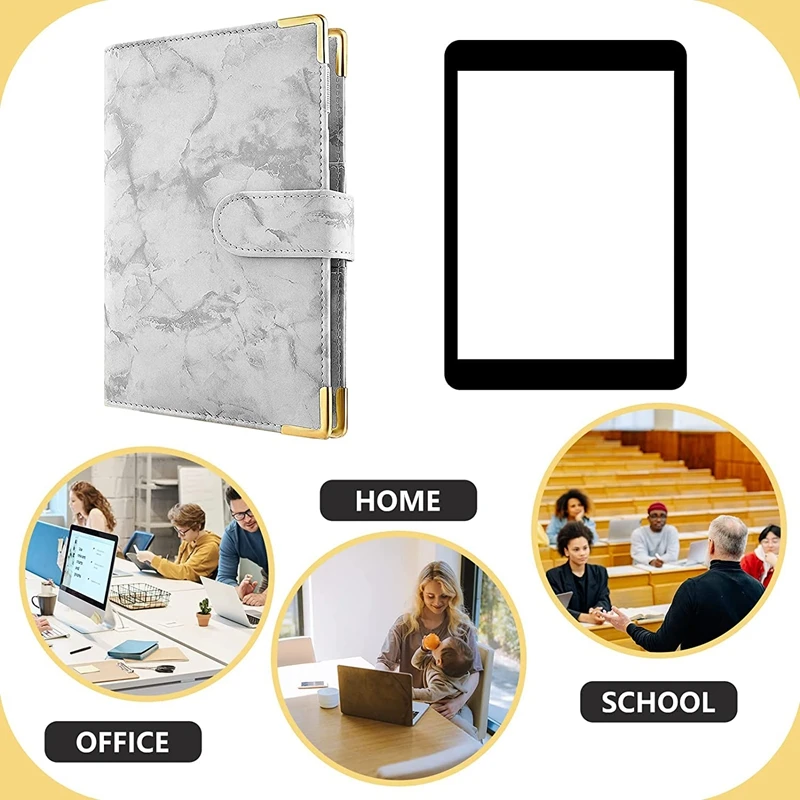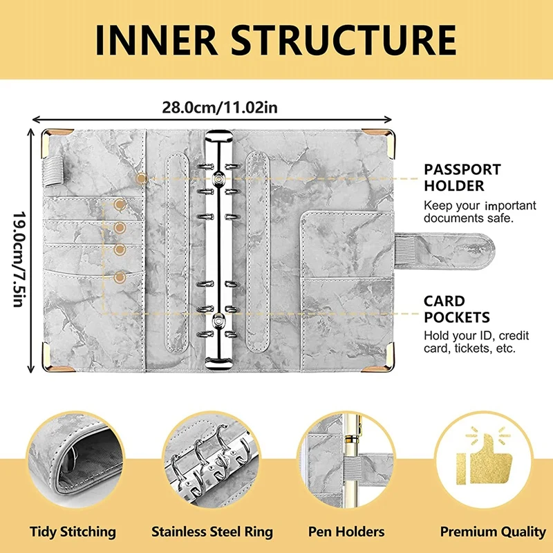 [Especialmente diseñado] el aglutinante para ahorrar dinero está hecho de cuero sintético de mármol de textura suave de alta calidad, que es antideslizante resistente al agua. Las Hermosas esquinas de metal pueden proteger las esquinas del desgaste al tiempo que agrega una sensación elegante a la carpeta A6.