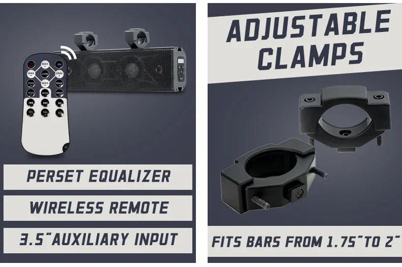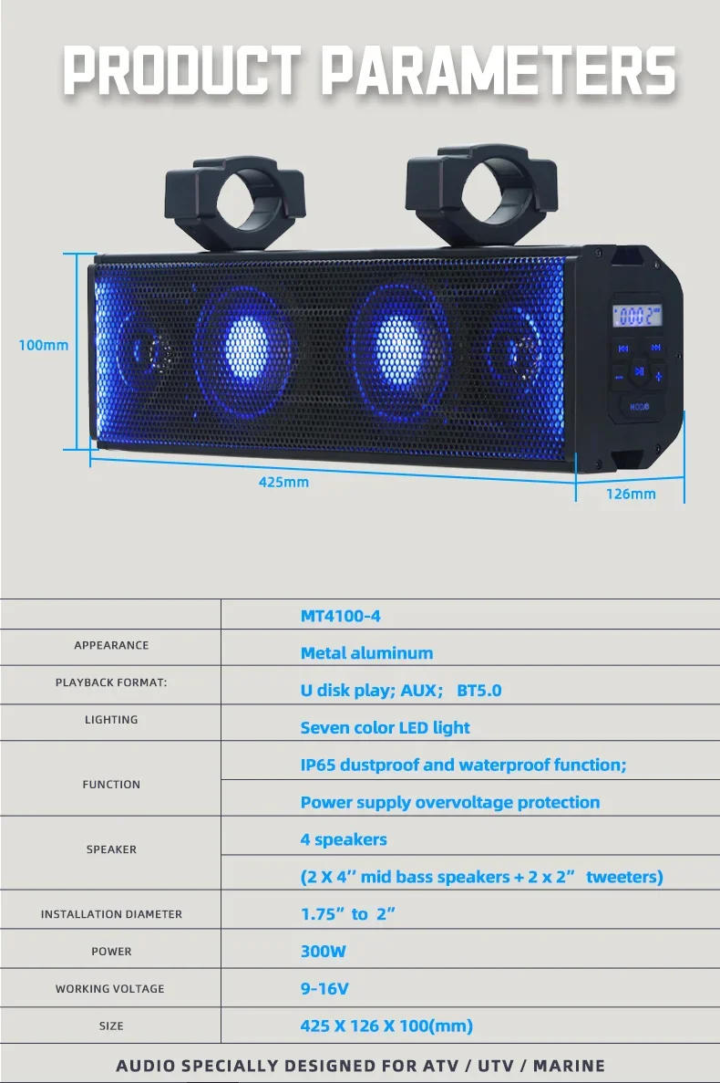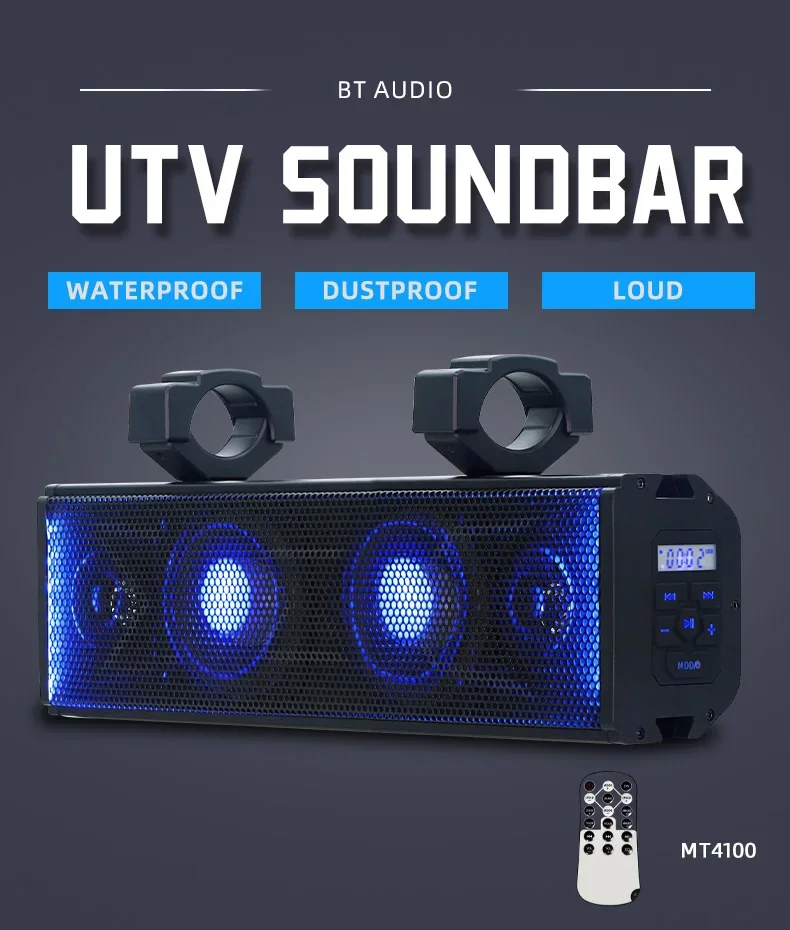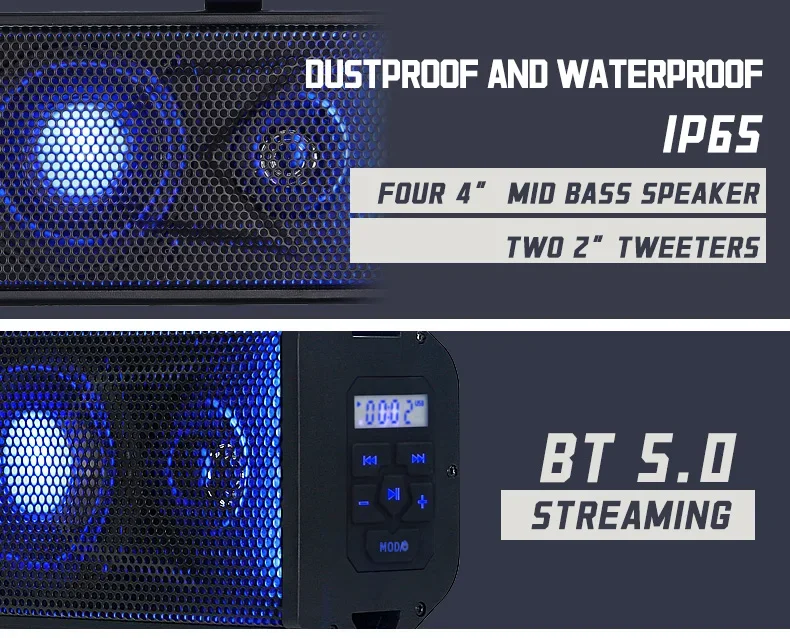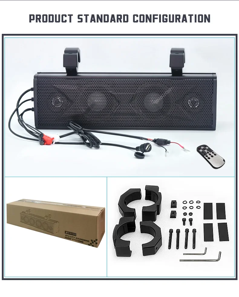 Especificación Nombre del producto Sistema Utv Atv Altavoces de audio BT Altavoz de barra de sonido marino Nombre de la marca ATRAMIENTO Número de modelo MT 4200 / MT 4100 Lugar de origen China Guangdong Material ABS+ALUMINIO AOLIO Nombre del producto Altavoz resistente al agua Amplificador marino Control remoto antirrobo Color NEGRO Apto para Carro de golf para motocicleta ATV UTV OEM OEM bienvenido Aplicación Al aire libre Calidad 100% probado Palabra clave UTV 4x100W / UTV 2x100W Característica Fácil instalación Colocación en el vehículo Delantero trasero Embalaje y entrega