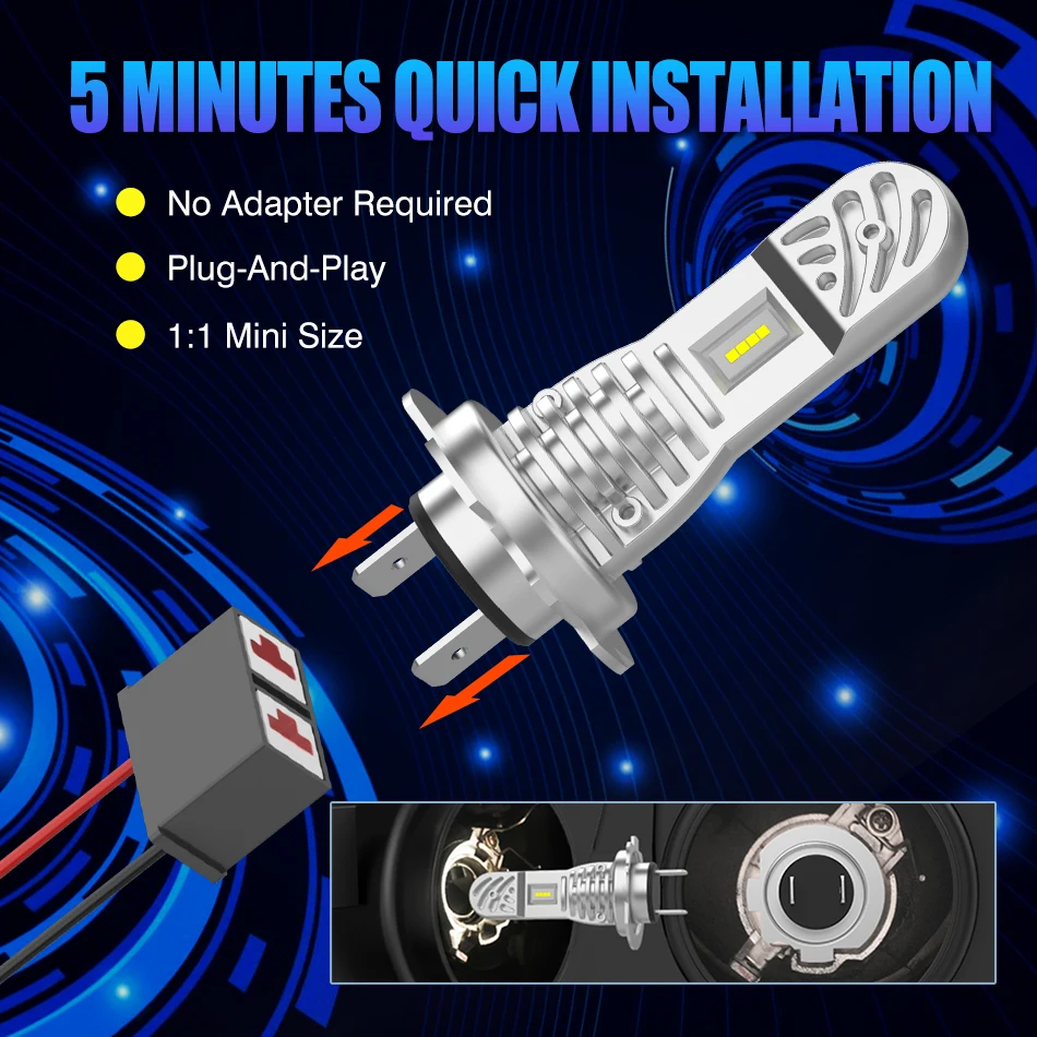 【 No polaridad, fácil de instalar】 La bombilla LED Carshark H7 adopta el último tamaño mini todo en uno diseñado, sin polaridad, sin adaptadores adicionales, para que pueda mantenerse alejado de todo tipo de problemas de instalación. Plug and play sin ninguna modificación