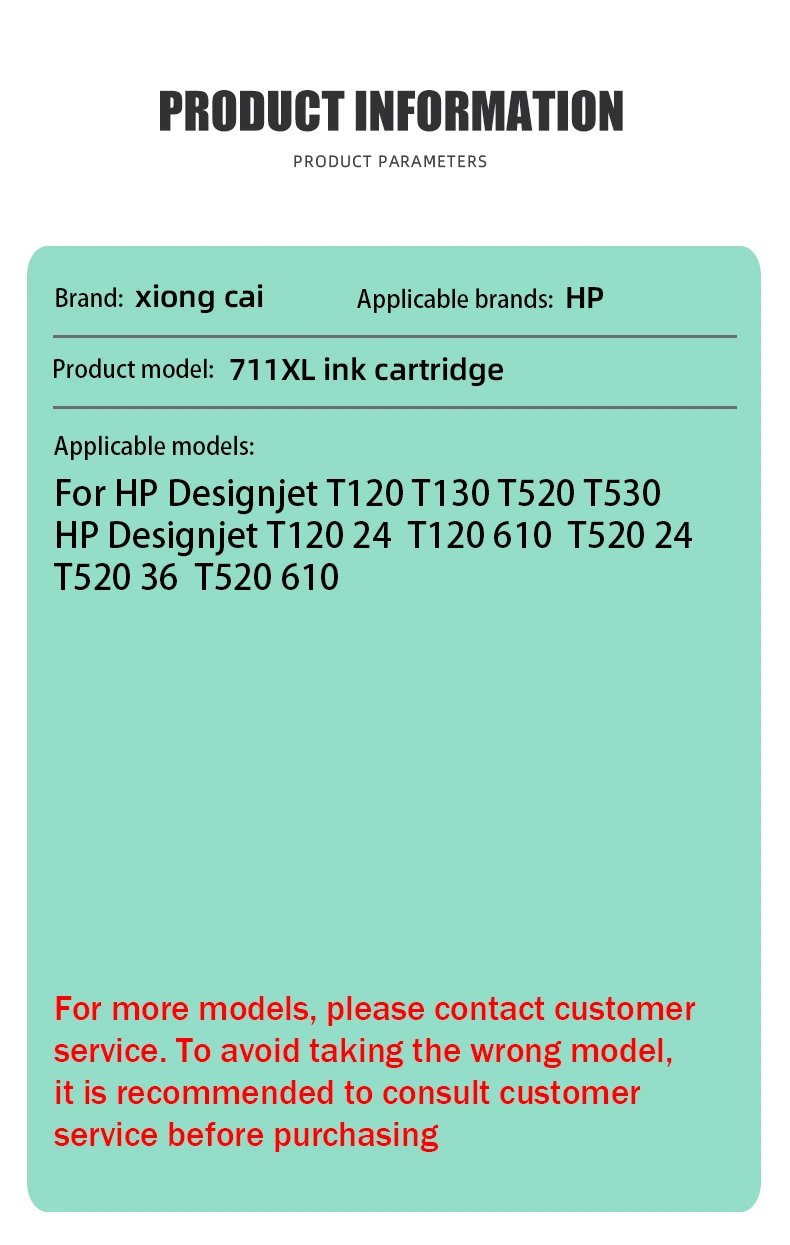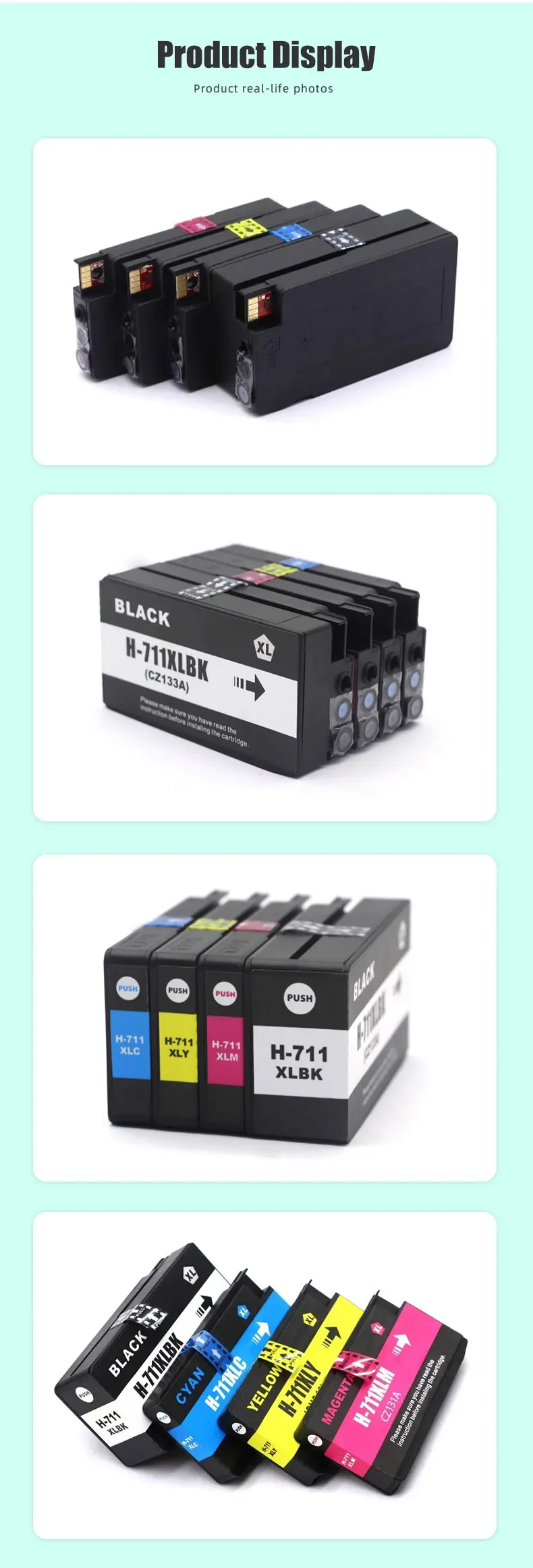 Nombre del producto:Cartucho de tintaMarca aplicable:Compatible con HPNúmero de cartucho:711XLColor:Negro Cian Magenta Amarillocapacidad:Negro 80ml Color 30mlModo adecuado:Compatible con HP Designjet T120 T520.