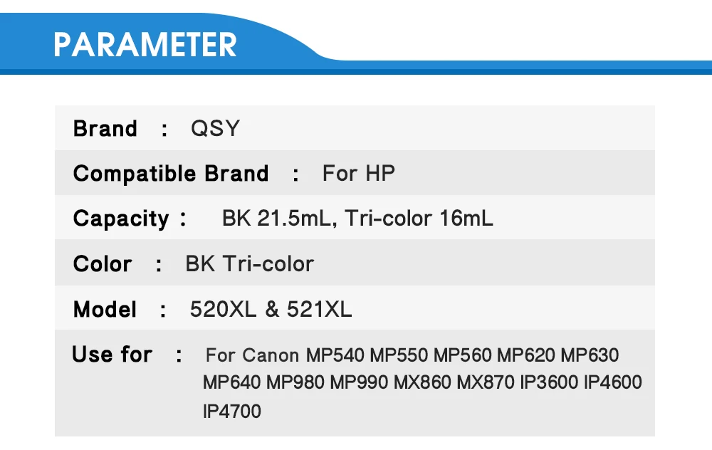 For printer model FOR canon compatible printer: PIXMA IP3600/IP4600/IP4700/ MX860/MX870 / MP550/MP560/MP620/MP620B/MP630/ MP640/MP640R/MP980/MP990 MP540/MP545/MP638/MP550/MP560/MP620/MP630/MP640/MP980/MP990/MX860/MX870