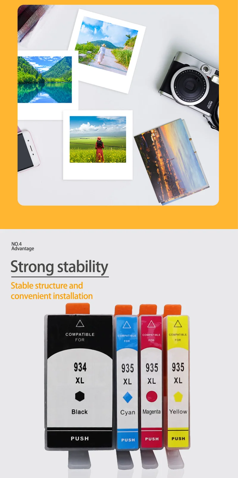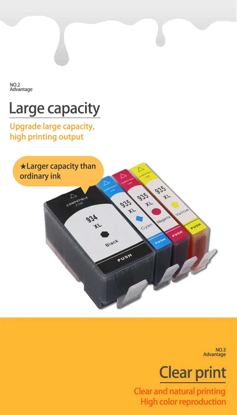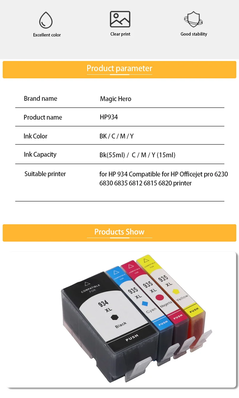Modelo compatible: 934XL 935XLColor: BK C Y M Capacidad: 934XL BK 25 ml, 100% nuevo cartucho de tinta compatible, muestra el nivel de tinta 935XL C 16 ml, 100% nuevo cartucho de tinta compatible, que muestra el nivel de tinta 935XL M 16 ml, 100% nuevo cartucho de tinta compatible, que muestra el nivel de tinta 935XL Y 16 ml, 100% nuevo cartucho de tinta compatible, mostrando el nivel de tinta Modelos de impresora compatibles (solo como referencia): Para HP Officejet 6812 e-All-in-One Para HP Officejet Pro 6830 e-All-in-One Para HP Officejet 6815 e-All-in-One Para HP Officejet Pro 6835 e-All-in-One Para HP Officejet Pro 6230 e-All-in-One