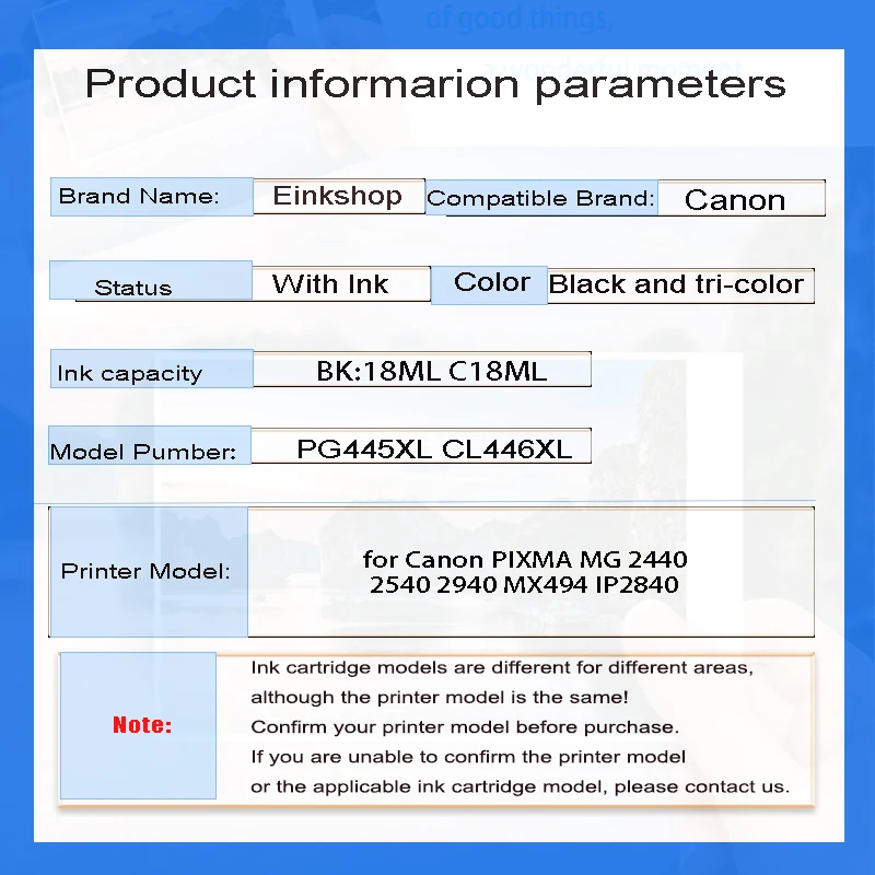 Antes de realizar un pedido, confirme si su cartucho de tinta es PG445.Si es así, tenga la seguridad de comprar.Si no es así, no realice un pedido porque incluso si el modelo de impresora es el mismo en diferentes regiones, se utiliza el modelo de cartucho de tinta.