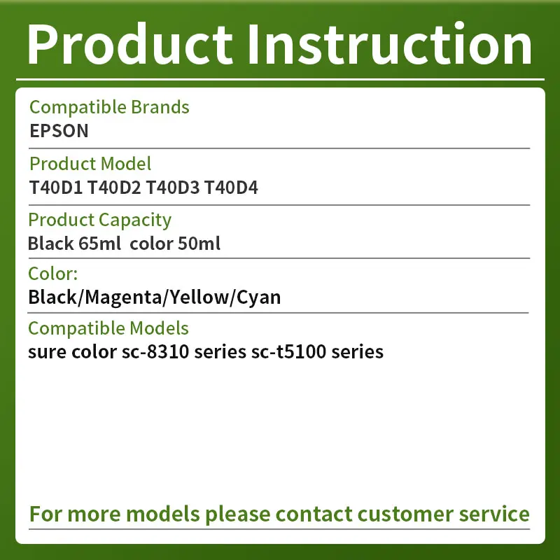 1 Juego de cartucho de tinta de pigmento de inyección de tinta para impresora T40D T40D1 T40D2 T40D3 T40D4 Compatible con Epson SureColor 2017, 2 unidades, 1 Juego ¡Atención! Antes de realizar el pedido, asegúrese de que el número de su cartucho original sea T40D1 T40D2 T40D3 T40D4 (el número del cartucho original es el que se encuentra en la parte superior de la caja). Para cualquier duda, póngase en contacto con nosotros para obtener asesoramiento.