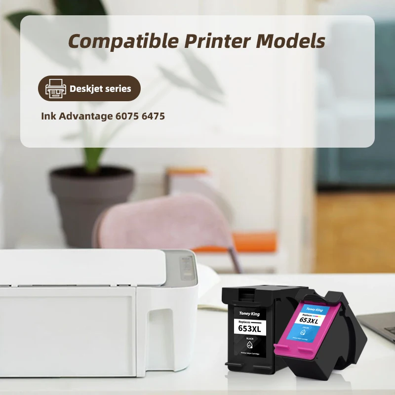 Marca: Toney KingNúmero de cartucho: Compatible con cartucho de tinta HP 653XLColor: negro, tricolor (C/M/Y)Estado del cartucho de tinta: tinta completaVolumen de tinta: 2, 1, 2, 2, 1, 2Rendimiento de página: Bk 600 páginas, 450 páginas tricolor (en formato A4, cobertura 5%)El paquete incluyeElige negro 1:1Elige 2 : 1 tricolorElige 3 : 2 negroElige 4 : 1 negro + 1 tricolorElija 5 : 2 negros + 1 tricolorElige 6 : 2 negros + 2 tricoloresCompatible con impresora (solo como referencia):Para HP DeskJet Ink Advantage 6075 6475Aviso:Confirme que el modelo de cartucho de tinta original de su impresora es para HP 653 (o 653XL).Si es para HP 653 (o 653XL), nuestro cartucho de tinta será compatible con su impresora.